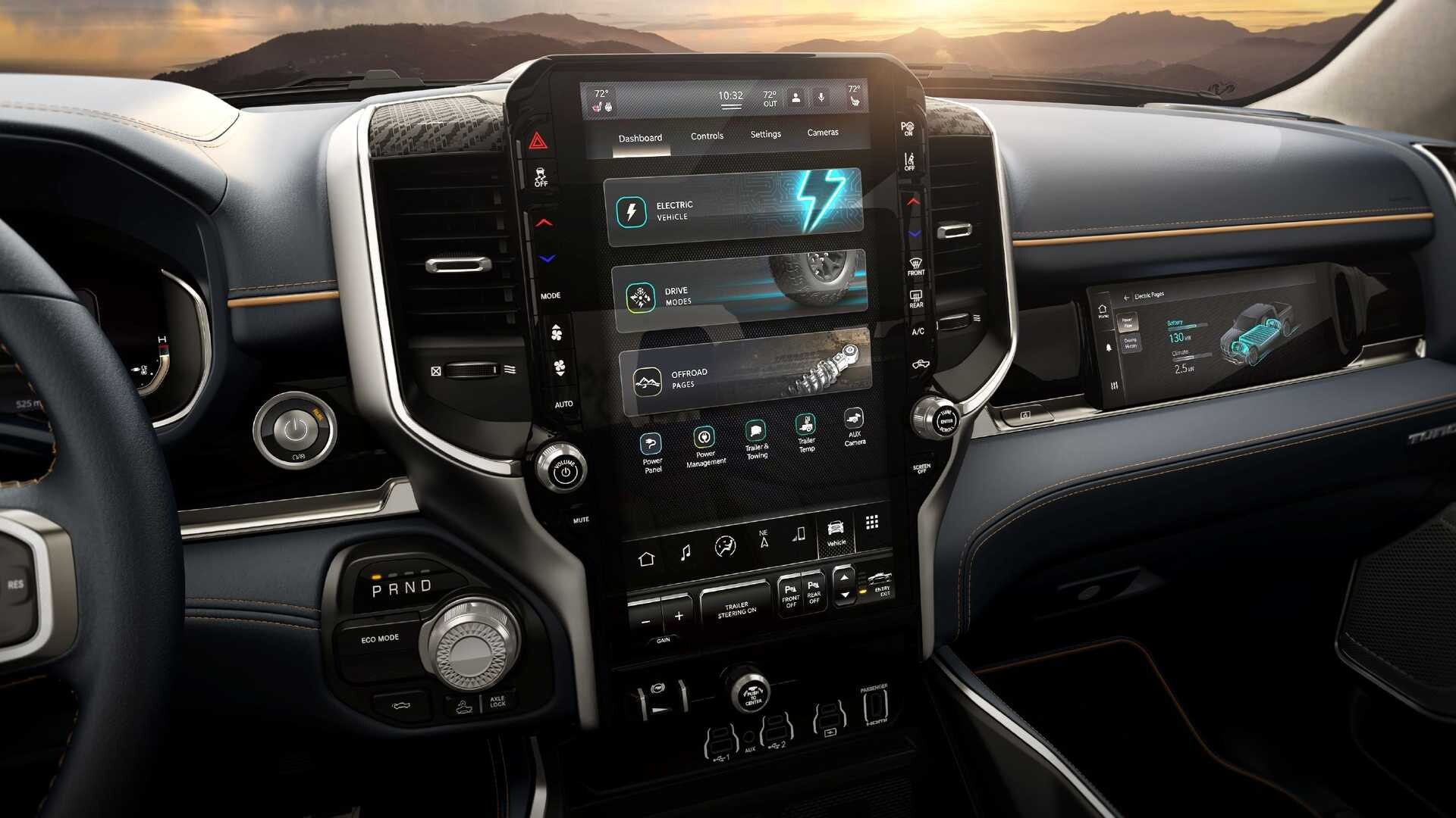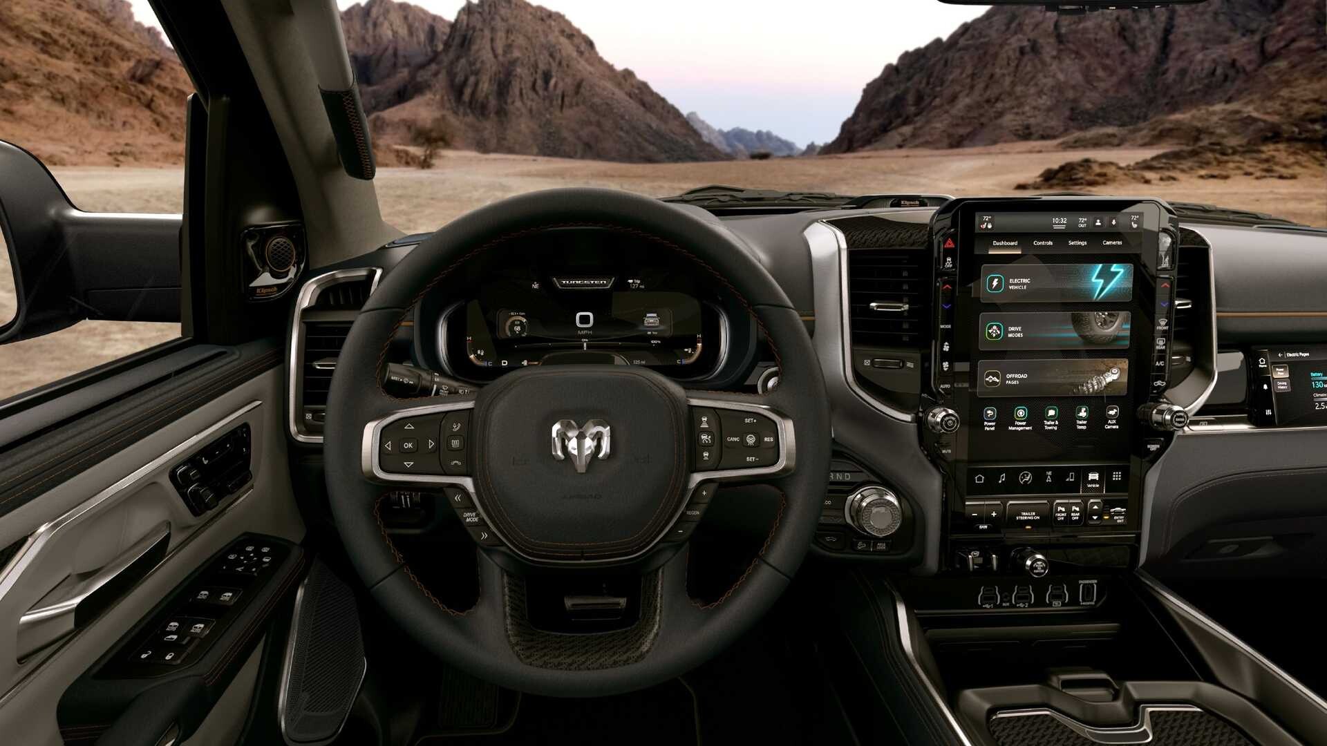 Kabina je prav tako osupljiva, z vrhunsko različico REV Tungsten ponuja vrhunske usnjene sedeže, avdio sistem Klipsch Reference Premiere s 23 zvočniki in tri zaslone na dotik velikosti 12, 14,5 in 10,25 palcev za voznika in sovoznika. Možnosti shranjevanja vključujejo skrinjico z električnim odpiranjem s 15 kubičnimi čevlji prostora in RamBox, prostor za shranjevanje na zaklepanje s 115-voltno vtičnico v notranjosti.