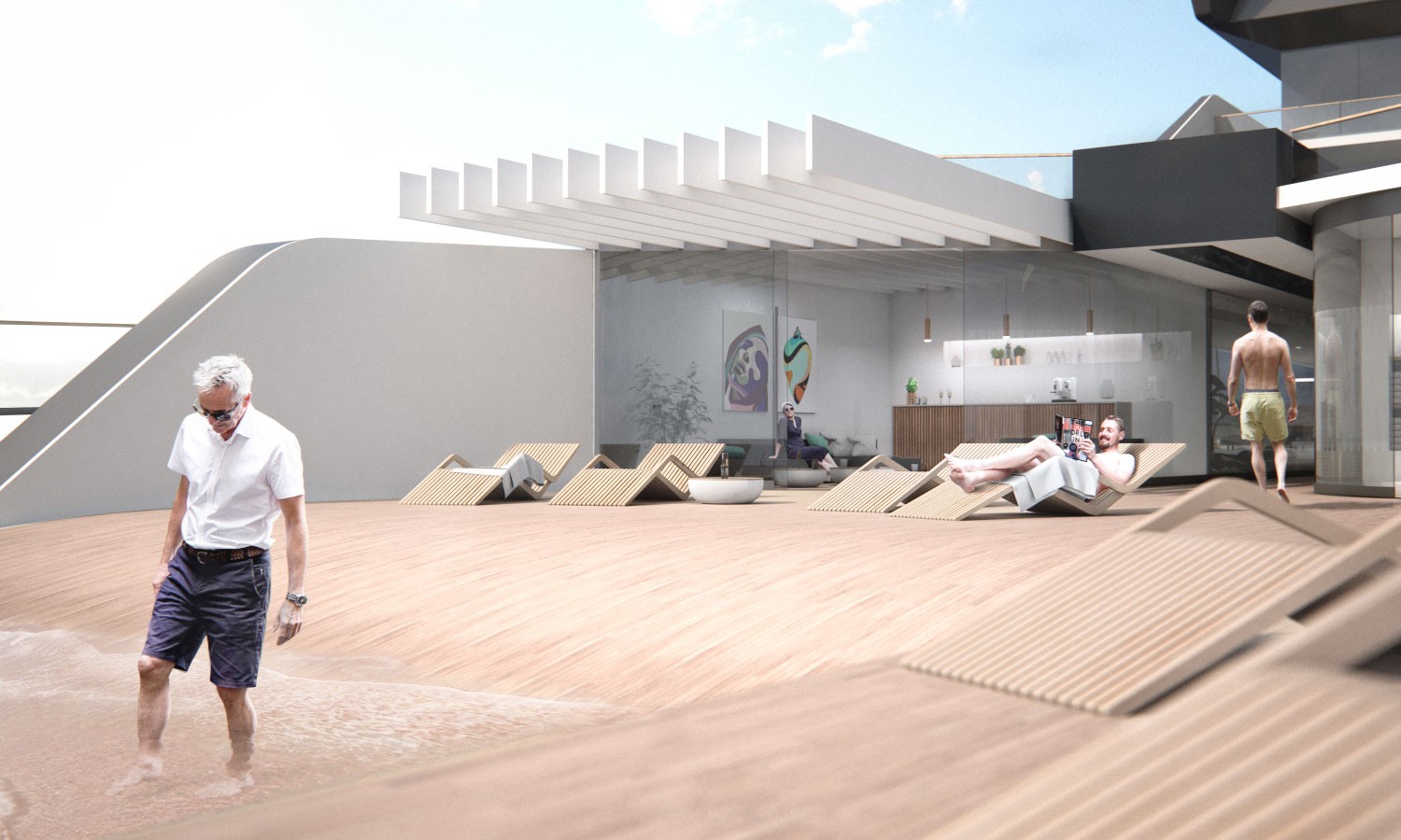 Väčšia časť lode teda ponúka panoramatické výhľady, ktoré sú vo väčšine súťaží obmedzené len na jednu časť lode. Keďže chce človeka priblížiť k prírode, niet divu, že sa môže aj pochváliť so záhradou, ale ani jedno vlákno nie je vynechané 20-metrový "jednodráhový" bazén. Posledná časť je navrhnutá ako pobrežie (terén sa postupne dvíha), aby more mohlo jemne naraziť do lode. Tiež sa môže pochváliť solárne panely, ktoré zaberajú až 300 metrov štvorcových plochy a sú napojené na lítium-iónovú batériu, ktorá umožňuje pomalú plavbu bez spotreby paliva.