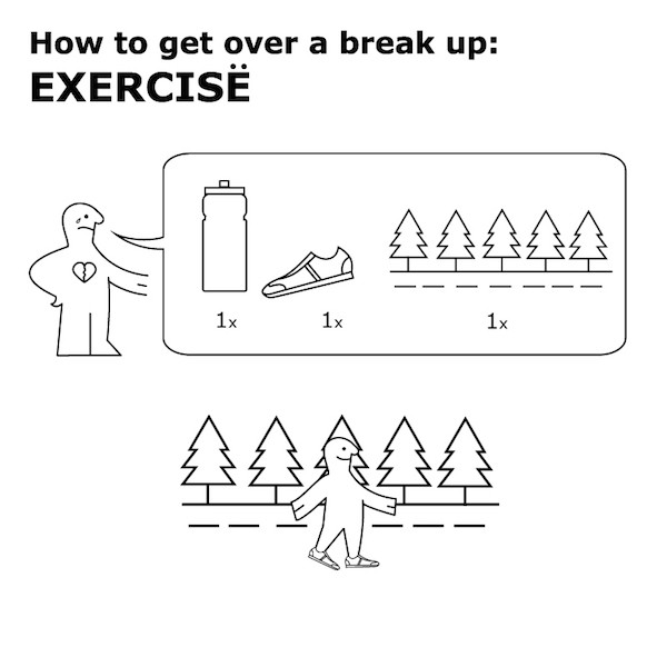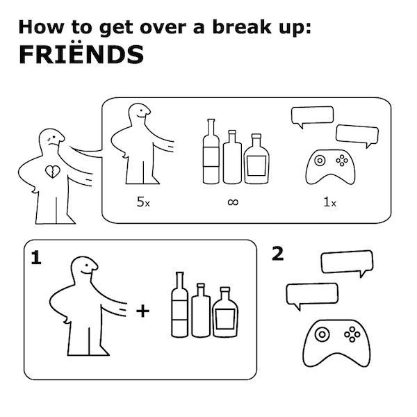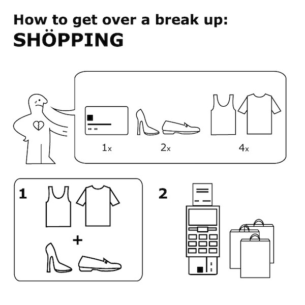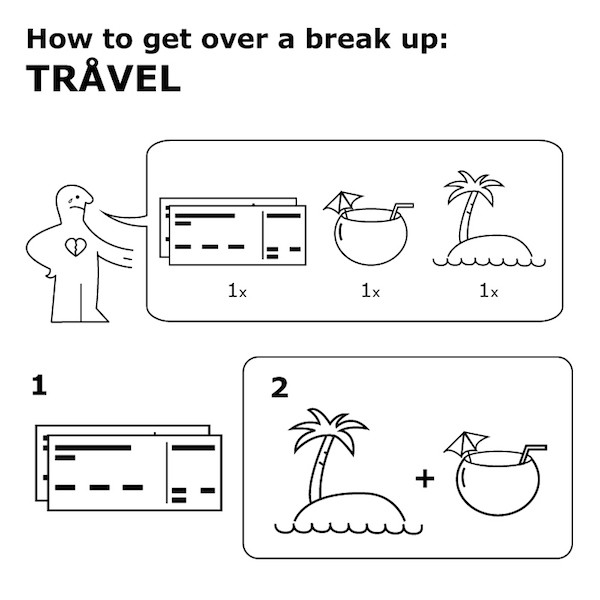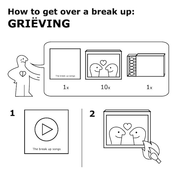 Ako prekonať rozchodak Ikea zdieľaná rada o láske? Dizajnér Nilasecov dom navrhol sériu spôsobov, ako utešiť neutíšiteľné srdce, inšpirovaný rozpoznateľné pokyny Ikea na montáž nábytku. Rovnako ako v prípade druhého, aj tu je postup opísaný jednoduchým spôsobom, ako na to a čo potrebujete.