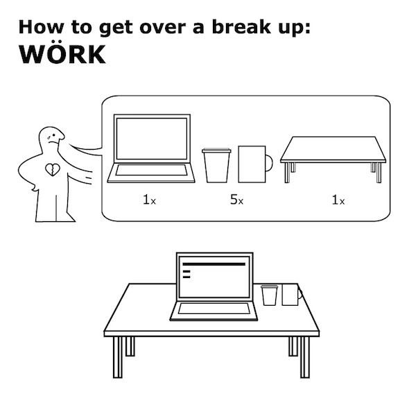 Ako prekonať rozchod, ak sa Ikea podelila o rady o láske? Každý rozchod, akokoľvek priateľský, má svoje následky. Koniec každého milostného príbehu je akousi porážkou. Niektorí si to berú k srdcu viac, iní menej. Často je ťažké zotaviť sa po skončení vzťahu a trvá to dosť dlho, kým sa začnete cítiť opäť dobre. Ak sa chcete rýchlo preniesť z rozchodu, vypočujte si rady Caisy Nilasec v štýle návodu od nábytkárskeho giganta Ikea.
