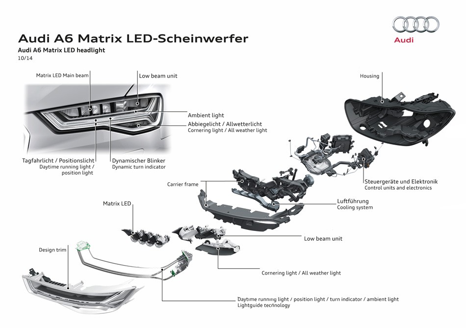 Audi Matrix LED-žarometi osupljajo tako kot polarni sij. Gre namreč za elektronsko krmiljen sistem prednjih matričnih svetlobnih teles s kopico projektorji, ki cestišče osvetljujejo glede na razmere. V primeru bližajočega vozila ali kolesarja se npr. svetilnost LED-žarnic zniža, s čimer eliminira možnost motenja ”nasprotnika”. Med drugim s sistemom nočnega vida prepozna neosvetljenega pešca in ga bodisi opozori s trikratnim opozorilnim utripanjem, v primeru, da se ustavimo, pa pešcu na cestišče vizualno signalizira, da lahko varno prečka.