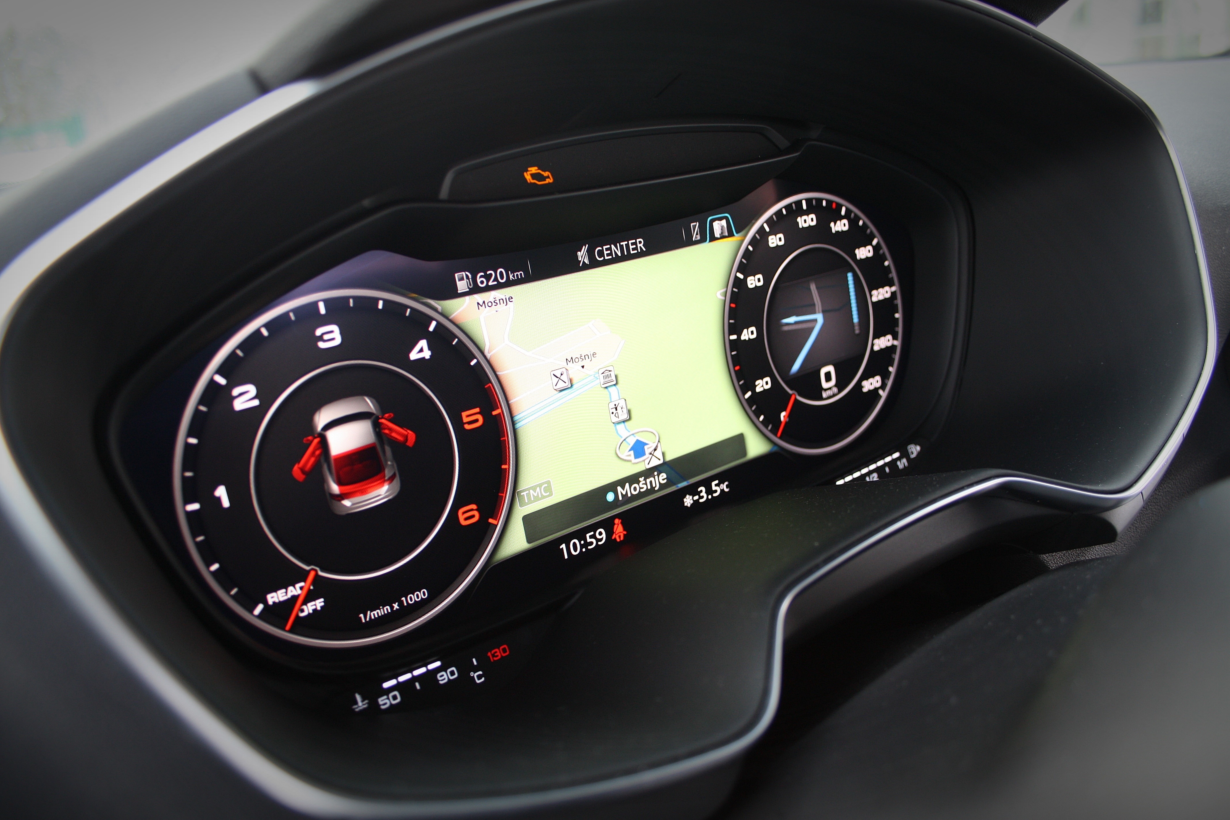 Posebnost predstavlja dejstvo, da na vrhu sredinske konzole, tudi v primeru navigacijske naprave, ni značilnega sredinskega zaslona, katerega vlogo so prevzeli v celoti digitálne meradlá pred voznikom. Tako zna imeti sopotnik pri navigiranju vozniku malce težje delo, je pa navigacija in ostali podatki tudi s sopotnikove strani enostavno in lepo berljiva.