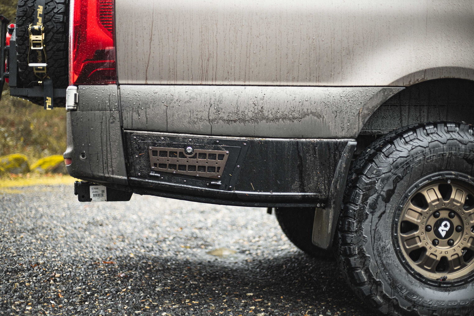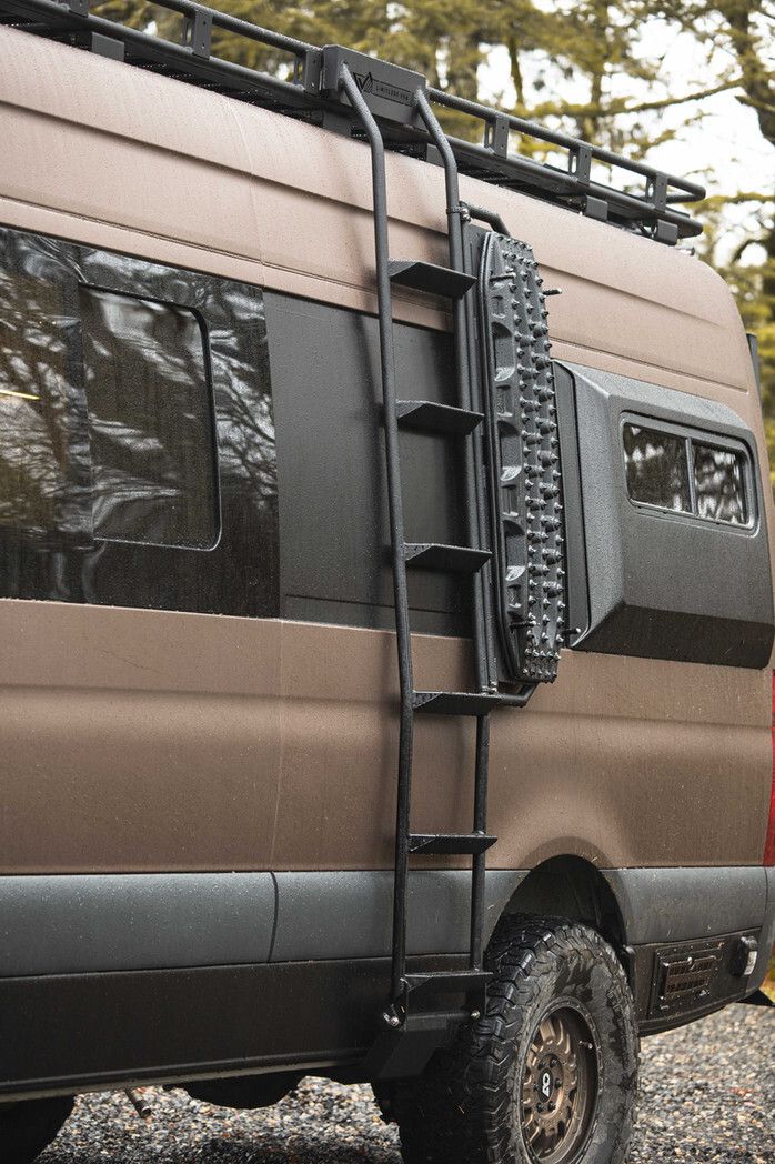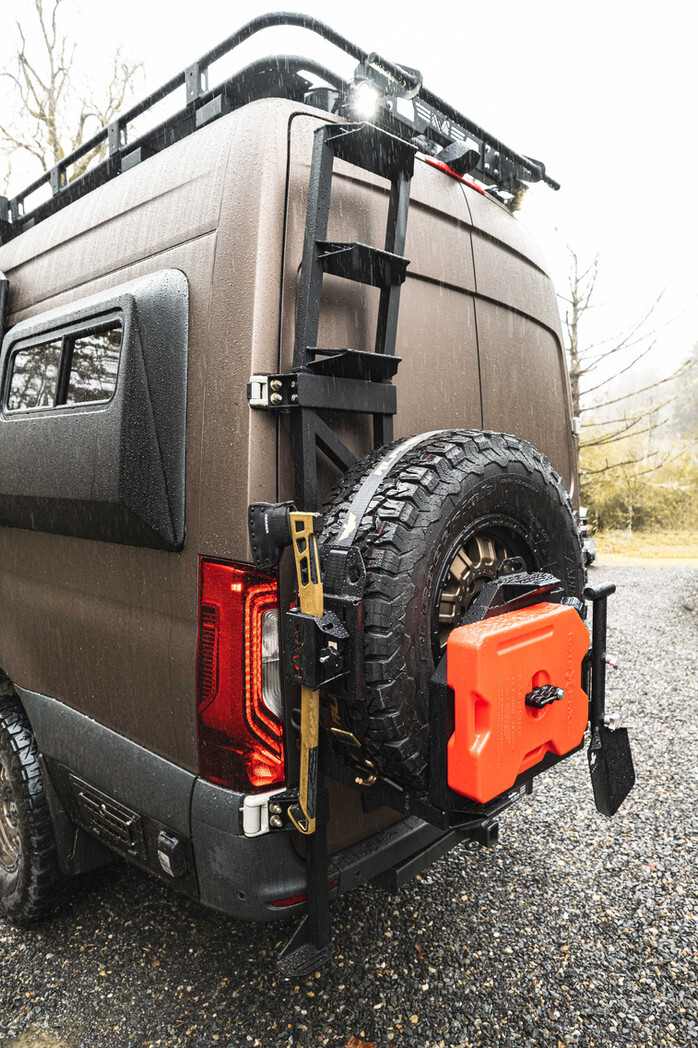 Po bokoch vozidla vedie funkčný rebrík, ktorý vedie k priestrannému strešnému nosiču vybavenému niekoľkými svetlami Baja Designs, ktoré osvetlia váš tábor alebo pracovnú plochu energiou podobnou dennému svetlu. Strešný nosič je nielen praktický na prepravu doplnkového vybavenia, ale slúži aj ako vyhliadková plošina, z ktorej si užijete hviezdne noci či ranný pohľad.