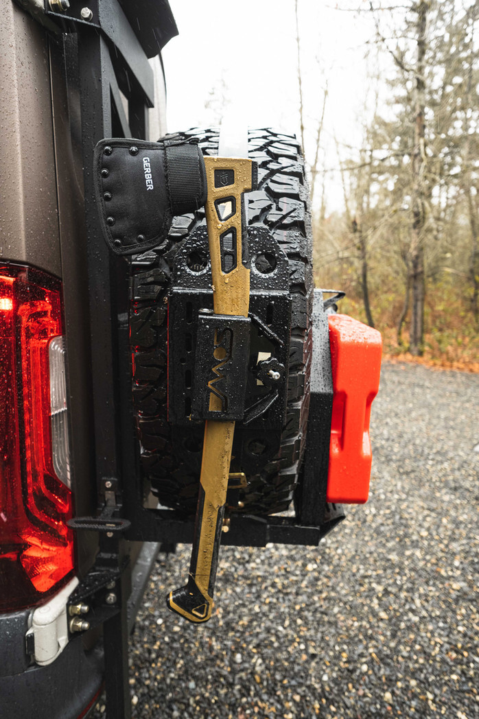 V zadnej časti vozidla sa hrdo týči držiak rezervného kolesa, ktorý nielenže dopĺňa exteriérovú estetiku, ale aj prakticky rieši problém s uložením veľkého rezervného kolesa. Nastaviteľný stojan na príslušenstvo ponúka priestor pre všetko od kanistrov s palivom po lopaty a sekery, vďaka čomu budete vybavení všetkými nástrojmi, ktoré potrebujete na akékoľvek dobrodružstvo.