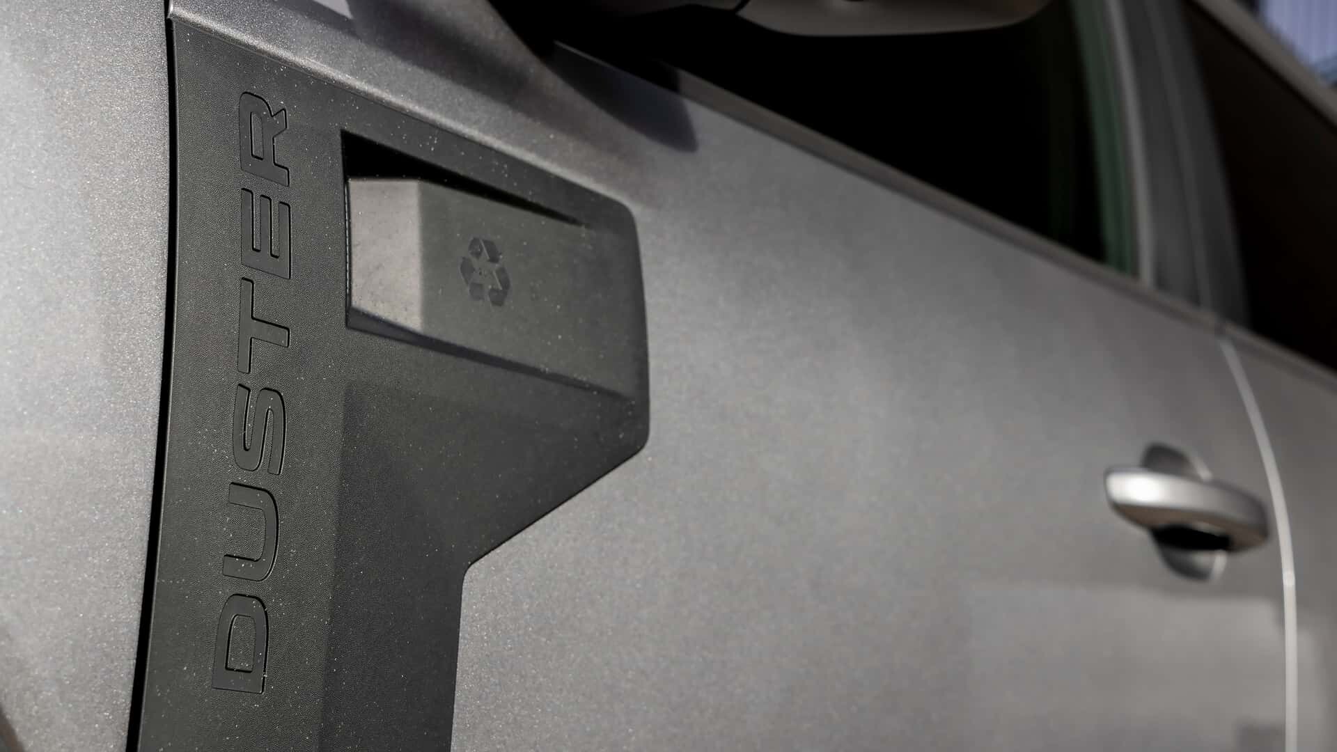 Duster 2024 sa môže pochváliť najnovším dizajnovým jazykom Dacie, ktorý pripomína menšiu verziu konceptu Bigster. Karoséria je navrhnutá s veľkým množstvom plastového obkladu vyrobeného z nového materiálu Starkle (20% recyklovaný polypropylén), ktorý dotvára robustný vzhľad terénneho vozidla. S modernizovanými osvetľovacími jednotkami, ktoré obsahujú LED svetlá v tvare Y, si Duster zachováva rozpoznateľný štýl Dacia.