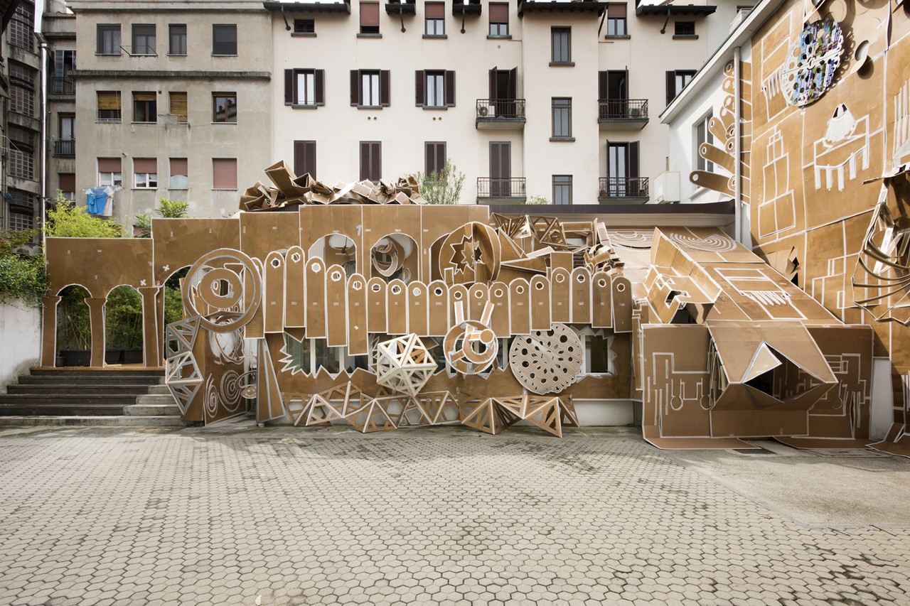 Na jednej z milánskych ulíc postavil kartónovú inštaláciu, ktorá nám pripomína niečo, čo sme doteraz mohli vidieť len v trojrozmerných detských rozprávkach, kreslených rozprávkach či snoch. Je to veľká kartónová rozprávka opretý o steny budov a vytvoril tak kartónový symbol Milána, ktorý je možné si pozrieť približne do konca mesiaca až do prvých silných dažďov.
