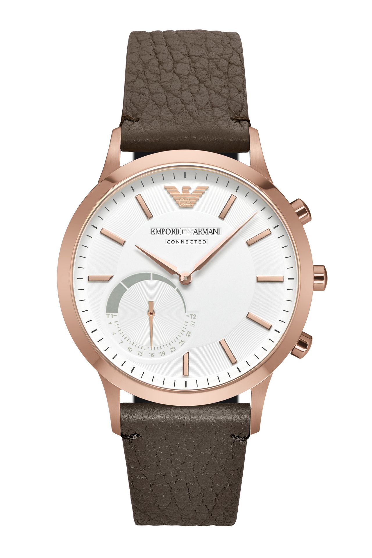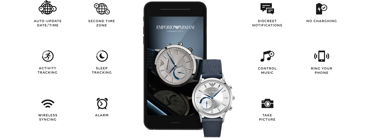 Módna značka Emporio Armani je spolu so značkou Fosílne spustila sériu inteligentné hodinky s analógovým ciferníkom EA Pripojené s rozpoznateľným Armaniho dizajnom. Náramkové hodinky sa pripája k smartfónu prostredníctvom pripojenia Bluetooth a aplikácie (pre zariadenia iOS a Android). Môže sa pochváliť štandardnými funkciami inteligentných hodiniek. Zmerajte používateľov činnosti, ovláda jeho spať, podporuje upozornenia, umožňuje manažment hudby a používa sa ako bezdrôtová spúšť na fotenie smartfónom.