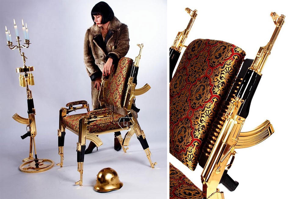 Stoličky sú zvyčajne vyrobené buď z dreva, kovu alebo plastu. Nie však stoličky umelca Rainiera Webera. Stoličky vyrobil zo slávnych útočných pušiek Kalašnikov. A čo viac, skutočné pušky AK-47, ktoré sú pozlátené. Ak máte v úmysle ovládnuť svet, táto stolička určite vyhovuje vašej postave.