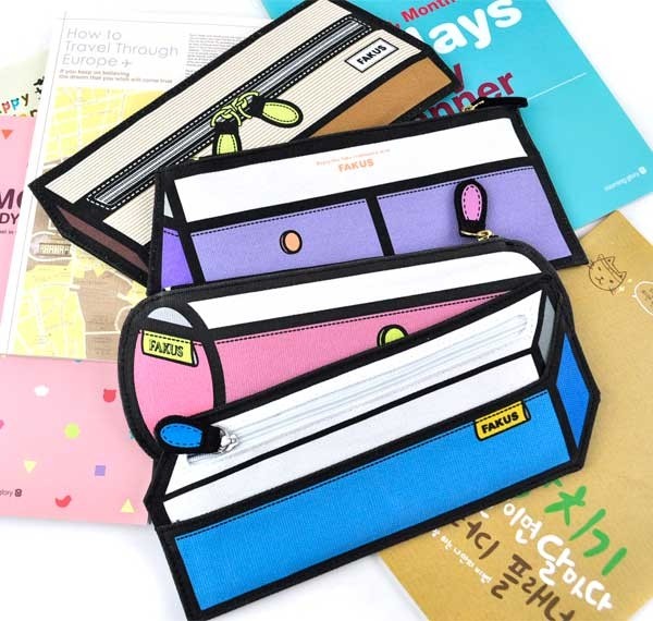 Fakusové perá kreslená 3D ilúzia a klamstvo dosiahnuť s čierny okraj okolo svetlého plátna vyrobené z bavlny a umelých vlákien, ktoré sú ešte vylepšené o imitácia príslušenstva, ako sú švy, zipsy a nášivky. Set hravé perá Fakus zahŕňa ružové, modré, žlté, fialové, zelené a hnedé verzie, oválne, štvorcové a kužeľové tvary.