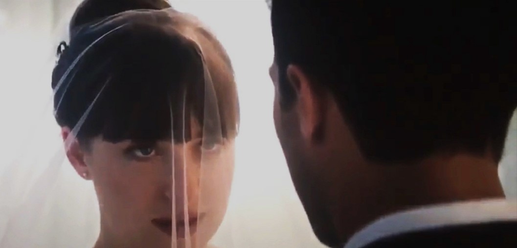 Napovednik za Petdeset odtenkov svobode se je skrival v zaključku filma Petdeset odtenkov teme (po odjavni špici) in ponuja vpogled v zadnji del, kjer vidimo Anastasio v poročni obleki.