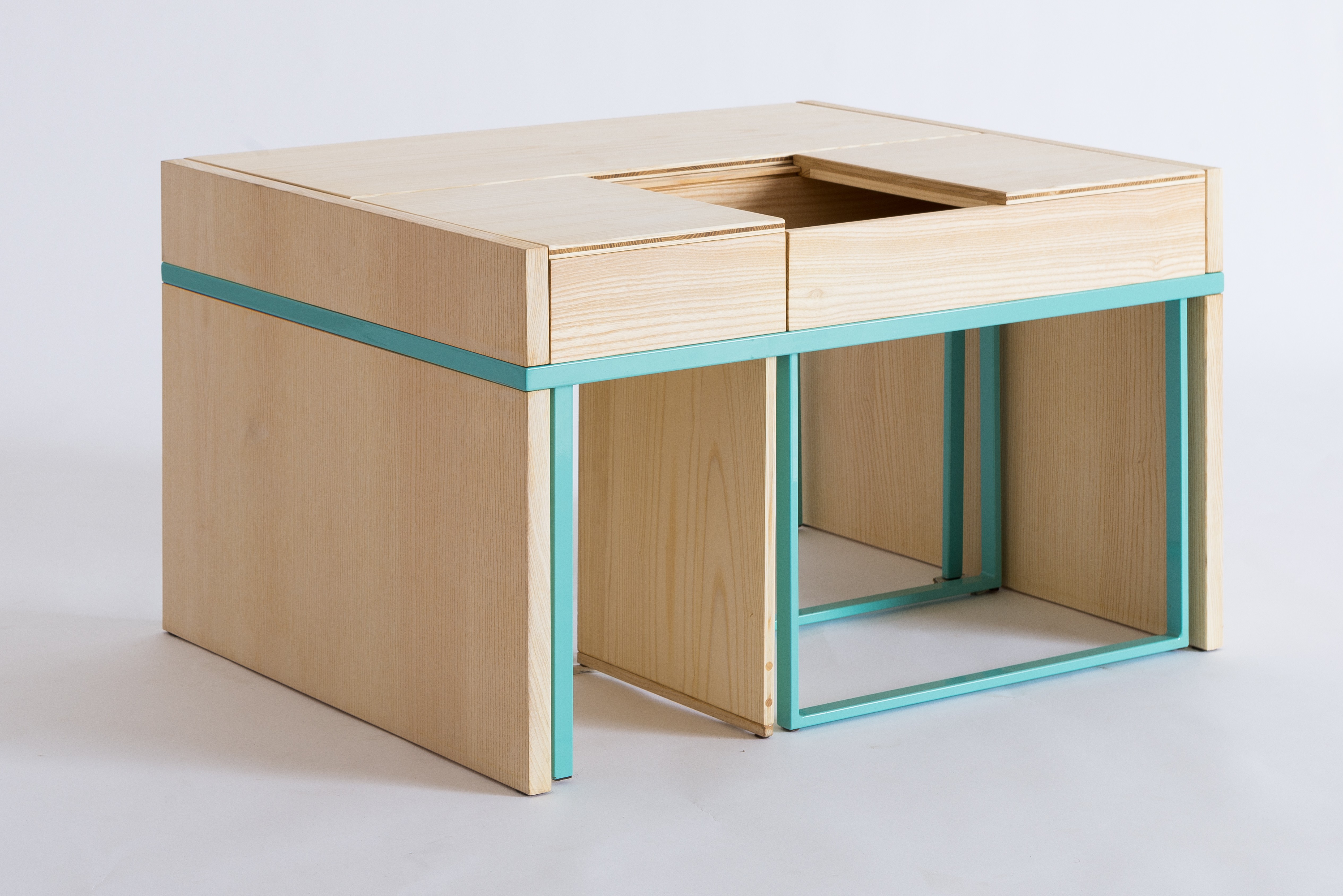 To je bil najin prvi produkt, ki sva ga oblikovali in izdelali. Hoteli sva oblikovati klubsko mizico, ki je večfunkcionalna, nudi različne načine uporabe in je hkrati preprosta ter izčiščena. Mladi, ki se preselijo na svoje, so velikokrat omejeni s prostorom, ki ga imajo na razpolago. Želeli sva jim ponuditi alternativo, kos pohištva, ki postane eno s stanovanjem in ob tem omogoča izjemno uporabnost in dober izkoristek prostora. Uporabniku v grobem ponuja vsaj pet različnih načinov uporabe, ostalo pa je prepuščeno domišljiji vsakega posameznika.