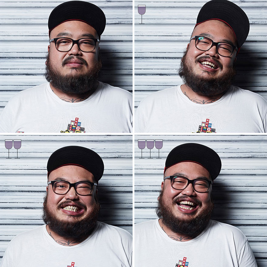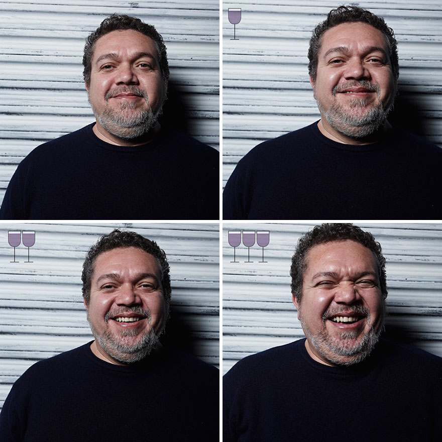 Kako so isti ljudje videti po enem, dveh in treh popitih kozarcih vina? Vsi vemo, da vsak nadaljnji kozarec ali steklenica alkoholne pijače vpliva na naše počutje in obnašanje, in prav to je v objektiv ujel brazilski fotograf Marcos Alberti.