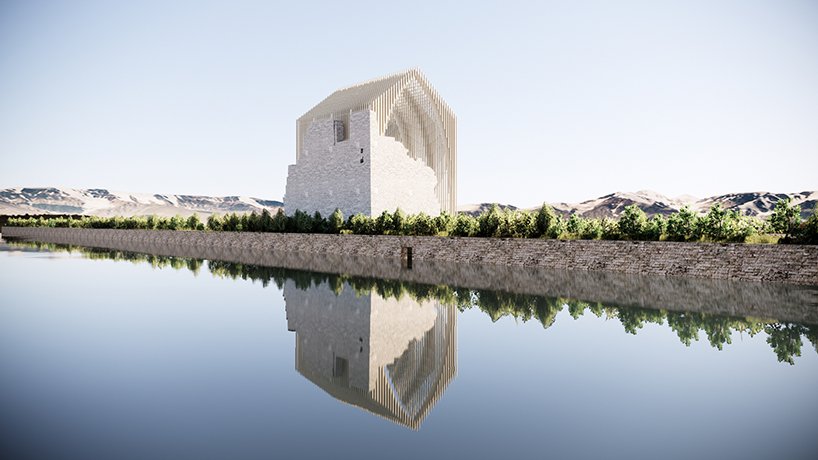Vonkajší tvar kaplnky napodobňuje siluetu ruín domu a ľahká drevená konštrukcia, ktorá ju obklopuje, bdie nad ruinami ako duch. Konštrukcia umožňuje hru svetla, ktoré ňou prechádza a vytvára fascinujúcu hru tieňov.