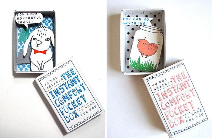 Miniaturne škatlice, ki nas potolažijo z drobnimi 3D sporočilci, ki se skrivajo v njihovi notranjosti, so odlično darilo in izjemen navdih za vse DIY navdušence. S škatlicami za vžigalice lahko naredimo marsikaj in kar je najlepše – z njimi lahko našim najdražjim polepšamo dan in jim pričaramo nasmeh na obraz. V galéria si oglejte nekaj prelepih primerkov, ki se jih je domislila nizozemska ilustratorka Kim Welling.