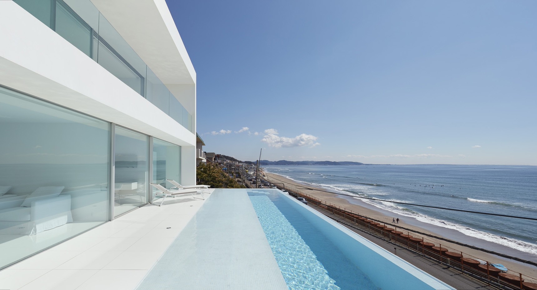 Šiniči Ogava je skupaj s sodelavci oblikoval bolj kot ne podolgovato počitniško hiško, ki jo krasi predvsem velika steklena stena oz. drsna vrata, ki vodijo na zunanjo teraso. To niti ne preseneča, saj so prostori obrnjeni proti morju. Notranjost in zunanjost sta oblečeni v belo keramiko, tako da se zdi, kot da je hišica iz enega kosa. Vgrajene luči, opremljene z velikimi pravokotnimi razpršilci, oddajajo svetlobo, zelo podobno naravni. Barvo svetlobe lahko prilagajate po potrebi in željah.