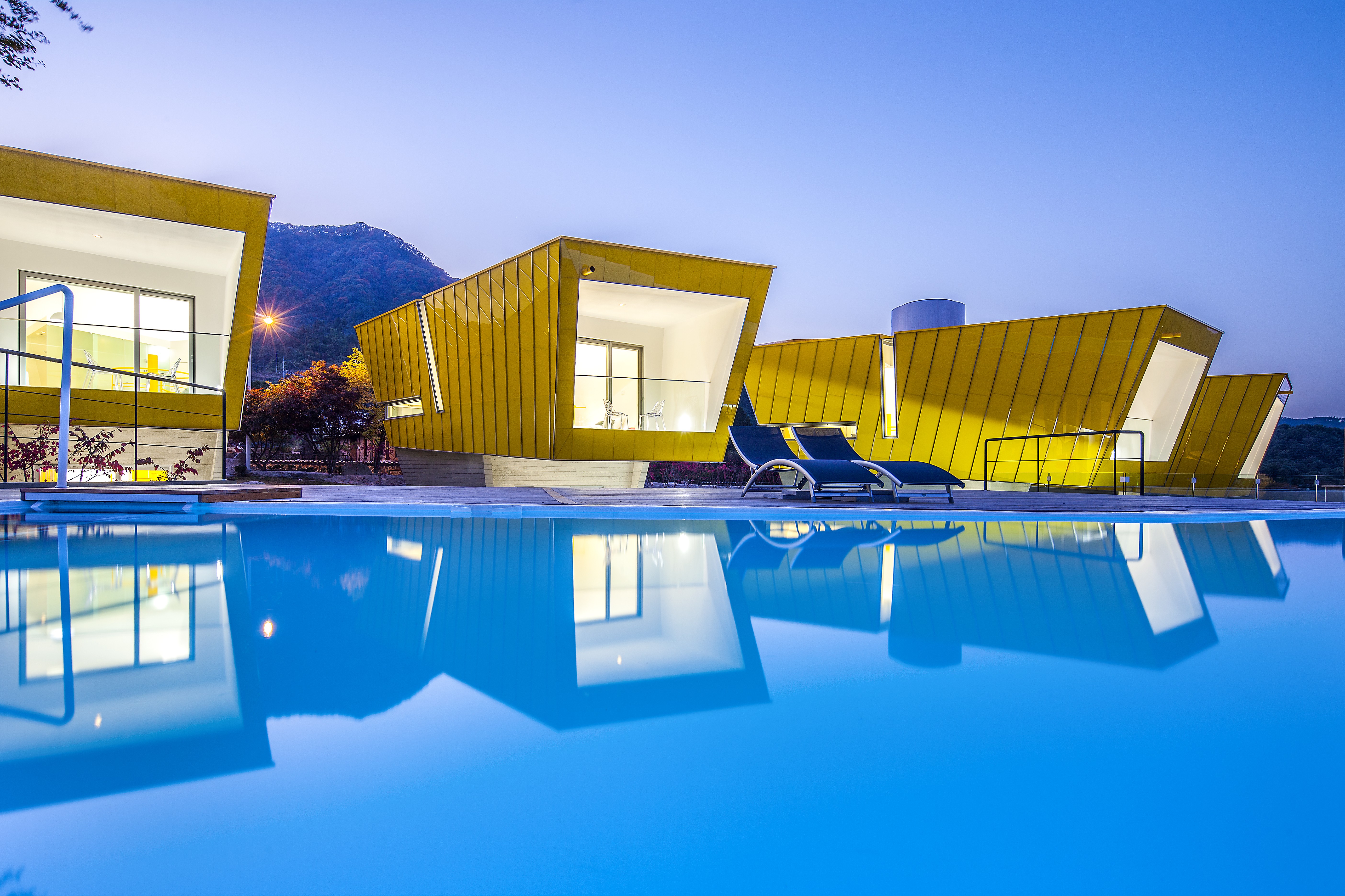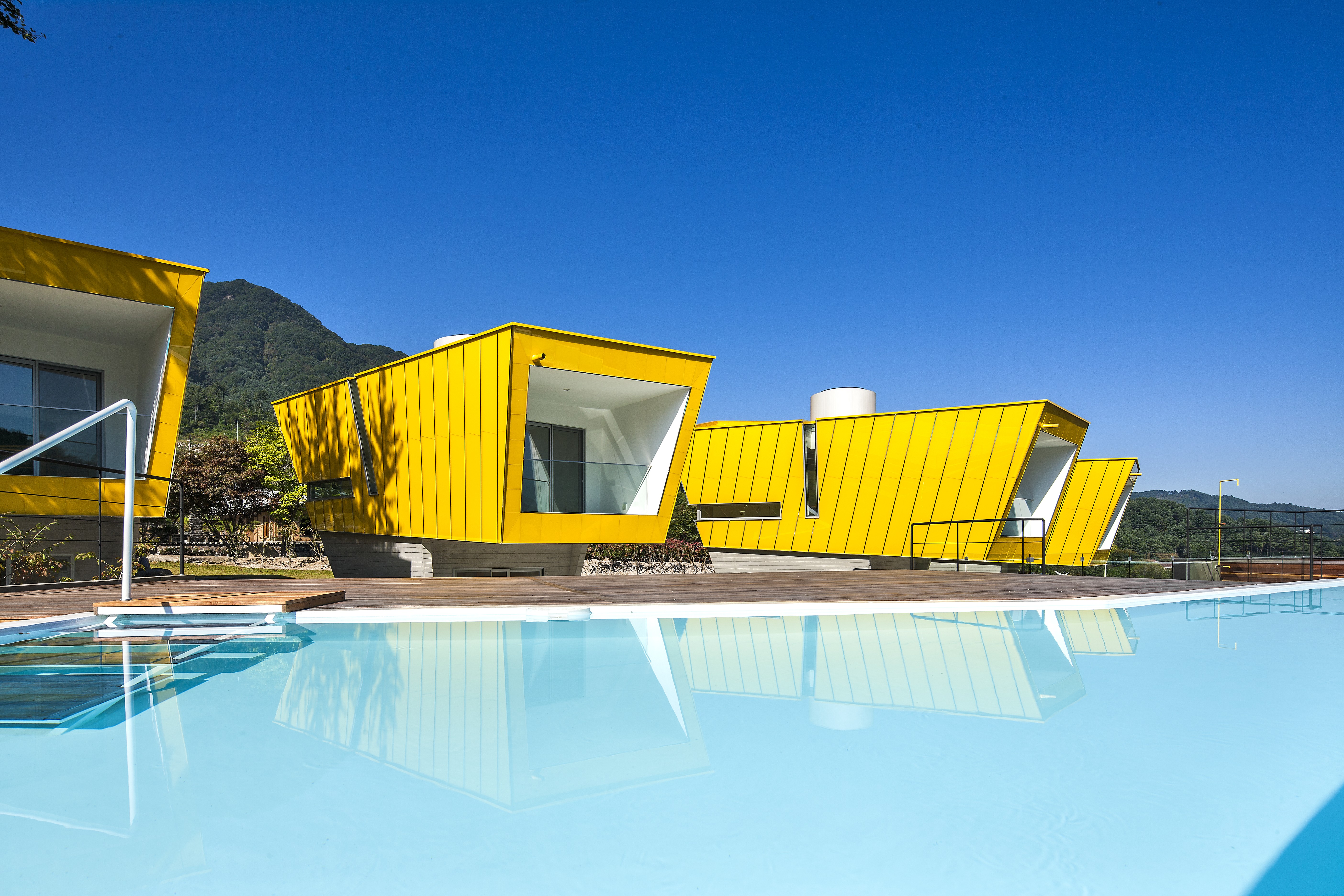 Krajina kúsok za Soulom odhaľuje malú osadu moderných víkendových domov - žiarivo žlté domy. Bol postavený na ubytovanie hostí určených pre neďaleký botanický park Morning Calm. Kórejské architektonické štúdio Koossino, poverené architektonickým návrhom, našlo inšpiráciu v tajomných sochách Moai, vďaka ktorým je Veľkonočný ostrov súčasťou svetového dedičstva UNESCO.