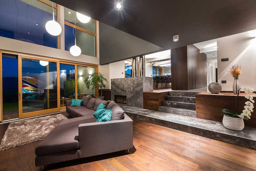 úžasné moderný dom, ktorý sa nachádza v posledných metroch Cerknice, je rovnako fascinujúci zvnútra ako zvonku. Priestory dýchajú a ich dušu dáva nábytok na mieru Slovinský rodinný podnik Blesk, ktorá je vyrobená z orechovej dyhy, steny sú na niektorých miestach pokryté s perzským kameňoma do obývačky vedú svetlé schody, pokryté Hotavľský mramor.