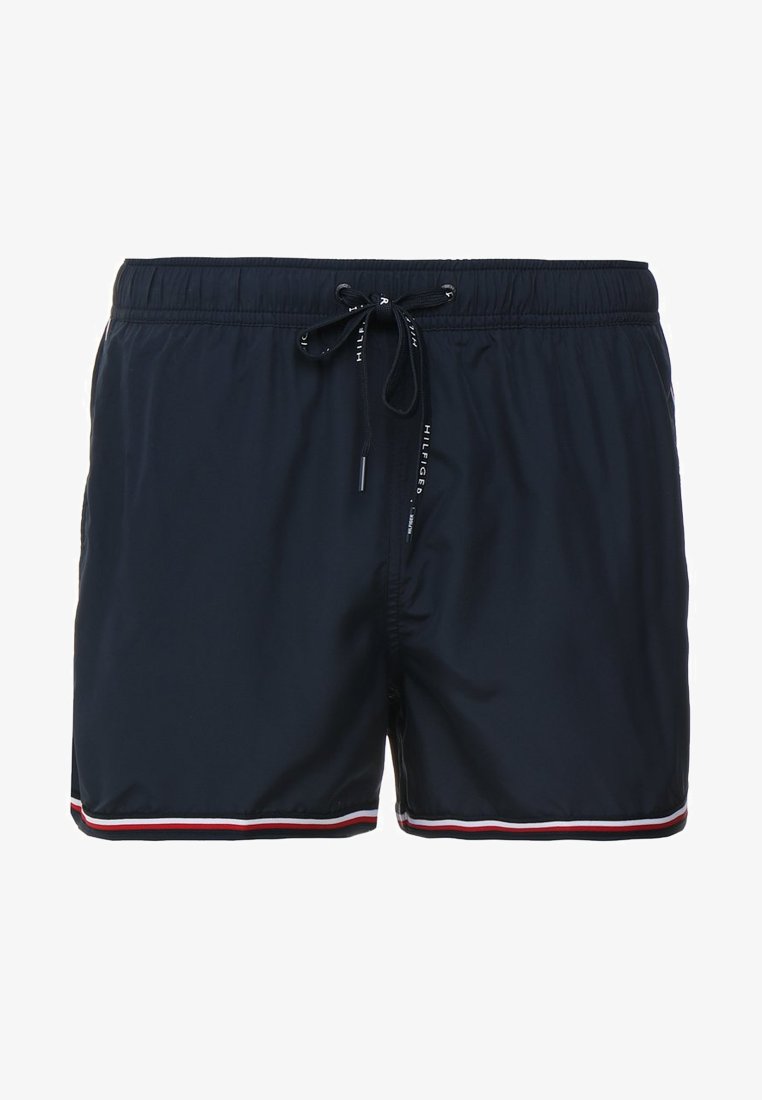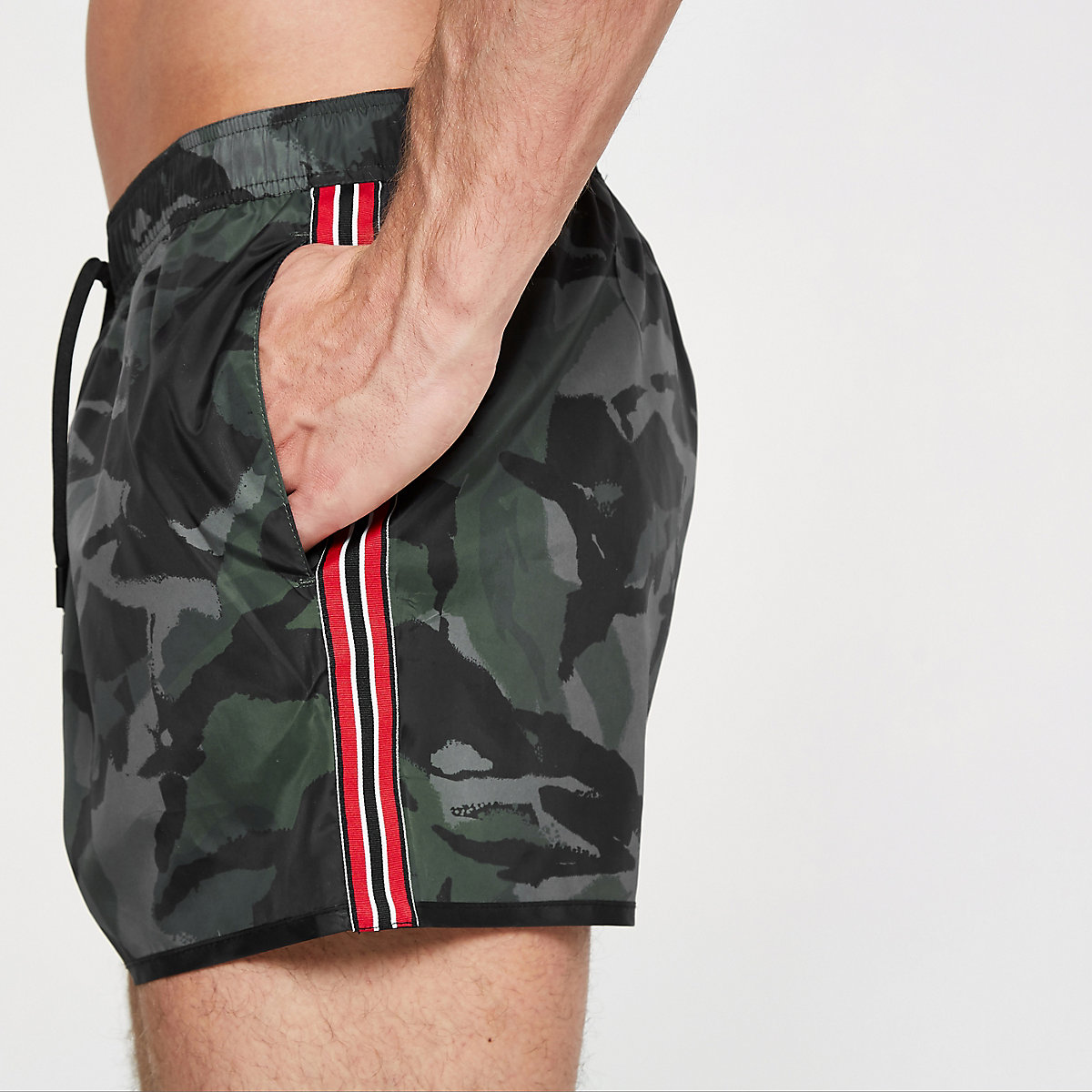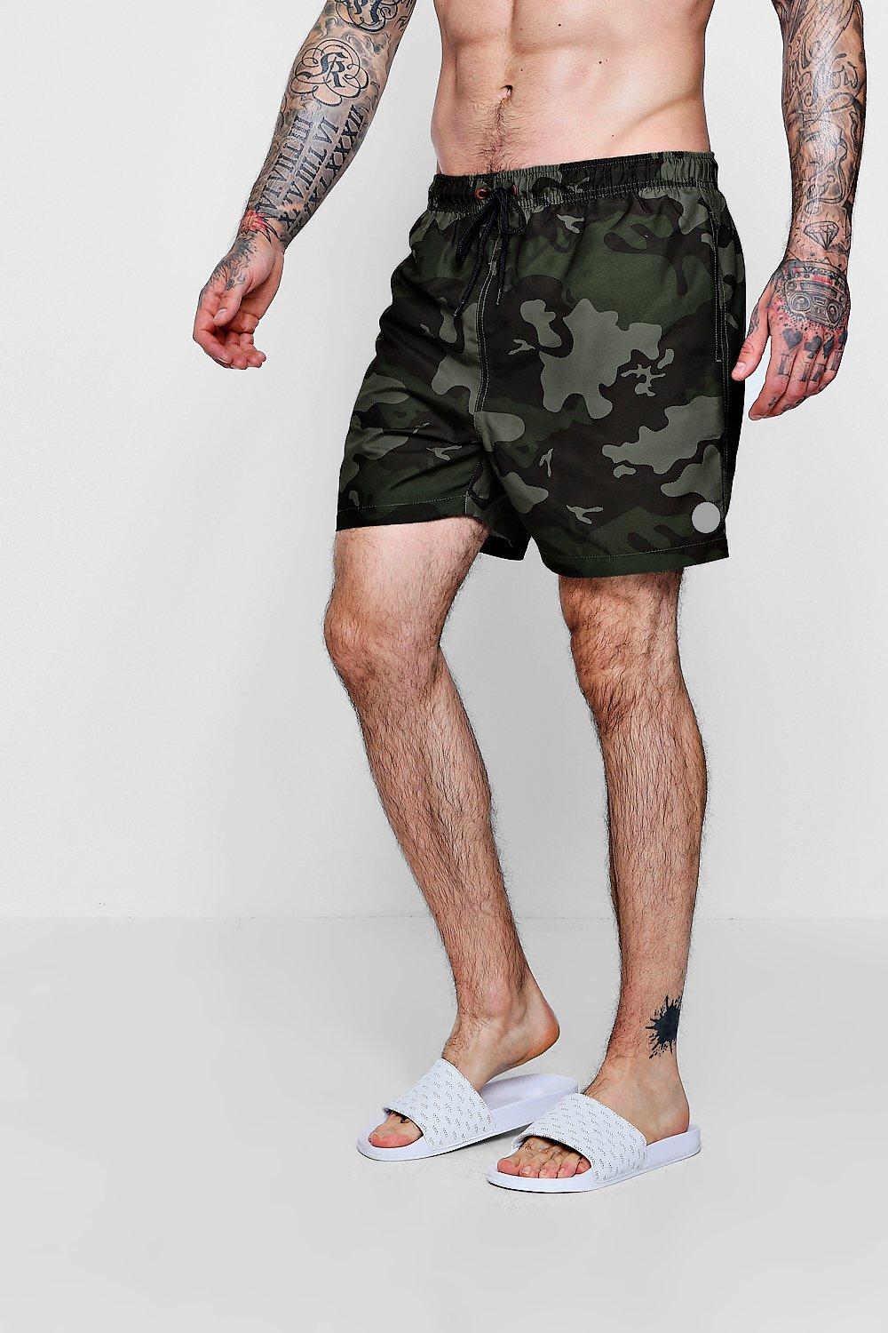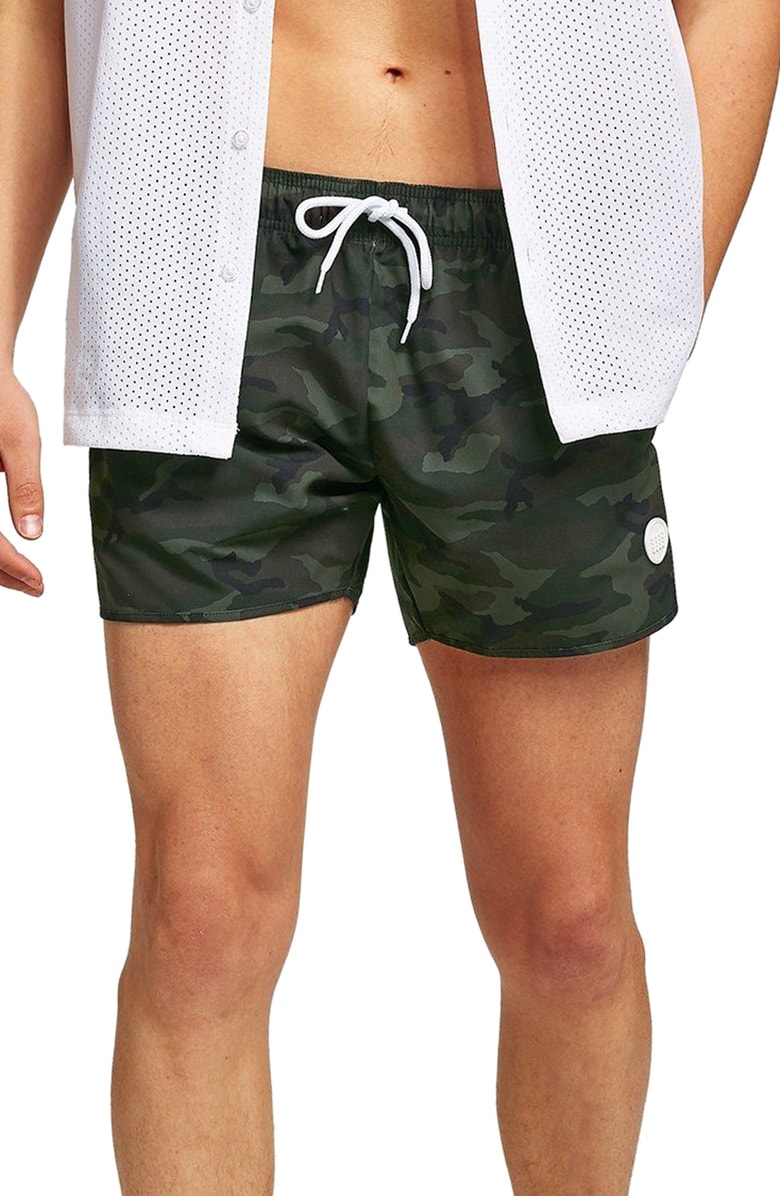 Moški s kopalkami z vojaškim vzorcem izražajo svojo moč. Če vam bo do poletja uspelo utrditi mišice na nogah, vam priporočamo, da izberete nekoliko bolj oprijete kopalke srednje dolžine.