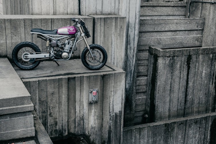 Vyzlečený takmer po okraj a so všetkými potrebnými prvkami by mohol byť taký prvý dojem. Mačiatka, inak priemyselný dizajnér, to napísal TE570 zostavený pre „krútenie sa cez kaňony a zadné cesty amerického severozápadu“. Vybavil ho vzduchové odpruženie, vyrobené špeciálne pre TE570, Predný kotúč 320 mm na brzde, nerezová výfukovým potrubím a tiež s nerezovou ochranou pre Hliníkový chladič Mishimoto. Má 6 prevodových stupňov. Má motor 17-palcové ráfiky, ktoré sú „obuté“. pneumatiky Shinko 705 . Prvok, ktorý upúta azda najviac, je hliník nádrž Husqvarna CR360 z roku 1973 fialovej farby. Pre pohodlnejšieo šoférovanie do nespevneného terénu je sedadlo vyrobené z extrémne hustej peny.