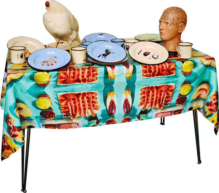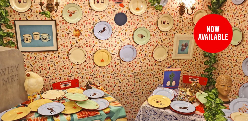 Lait motiv nenavadne, izjemne kolekcije krožnikov, skodelic in prtov so fotografije iz revije, prenešene na izdelke. Po znameniti kolekciji “Estetico Quotidiano” pred desetimi leti ter liniji, kjer so združili tradicionalne kitajske in angleške porcelanaste podobe, Seletti še vedno preseneča in osuplja. Surrealistična, odpuljena linija z motivi kokoši, rok, konji, kosi mesa, noži, podkvami,… ni za vsak okus.