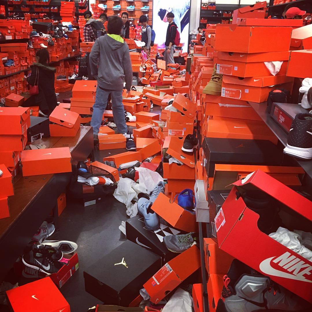 Tako kot večina trgovin je tudi Nikeova trgovina v Seattlu ta dan ponujala posebne popuste in na lastni koži občutila objestnost kupcev, ki so za seboj pustili pravo razdejanje, ‘vredno’ potresa najmanj sedme stopnje po Richterjevi lestvici.