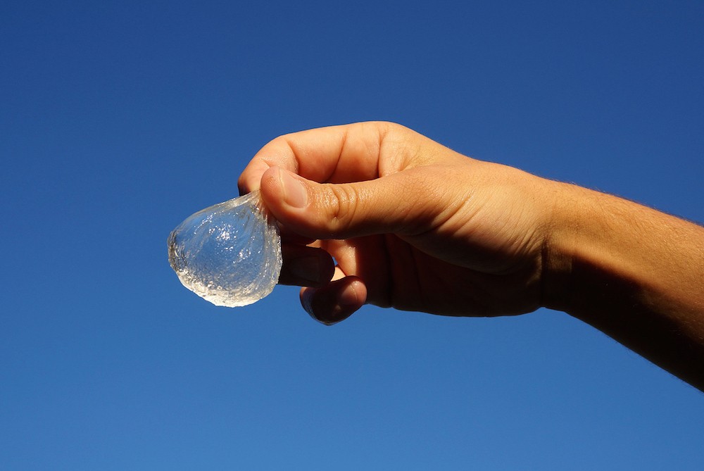 Väčšina obalov predstavuje veľa environmentálna záťažAle nie balenie londýnskej spoločnosti Laboratórium Skipping RocksToto bolo vyrobené spoločnosťou biologicky odbúrateľný materiál (rozpadá sa v priebehu niekoľkých týždňov), čo môže zadržiava vodu, má tvar gule.