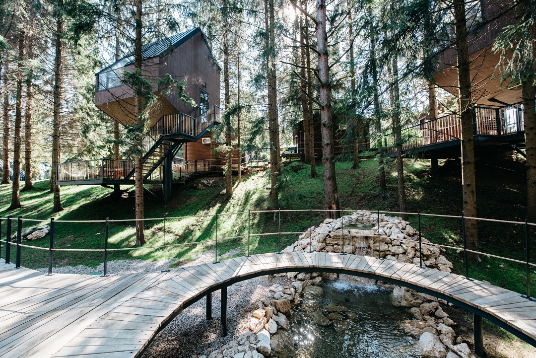 Päť špeciálne vybavených drevených domov Rozprestiera sa na troch podlažiach, s dvomi kúpeľňami, dvomi spálňami, obývacou izbou a kuchyňou, ponúka pohodlné a luxusné ubytovanie pre štyri osoby. Nachádza sa na samotnom jazere deväť menších domov s manželskou posteľou a kúpeľňou. Súkromie zabezpečujú okolité stromy, ktoré v horúcich dňoch ponúkajú aj príjemný tieň, no za zmienku určite stojí aj fakt, že vďaka dobrej izolácii a ústrednému kúreniu sú k dispozícii na celoročný prenájom.