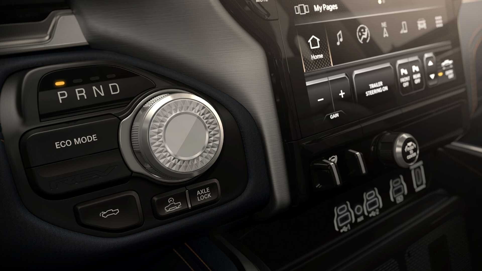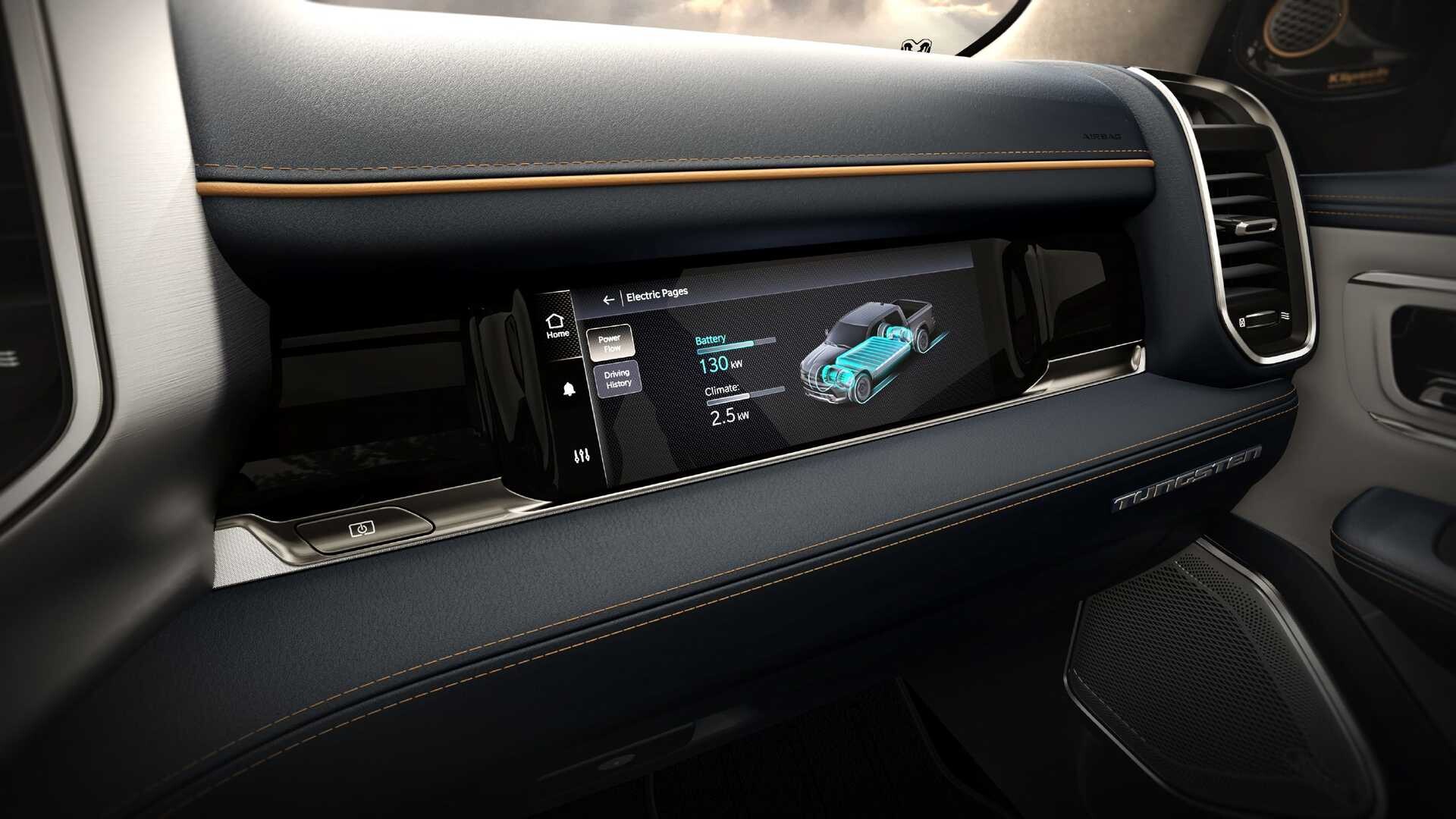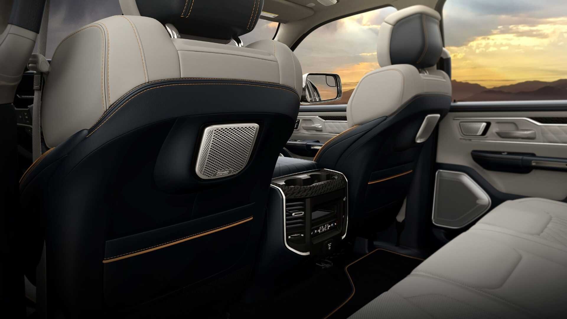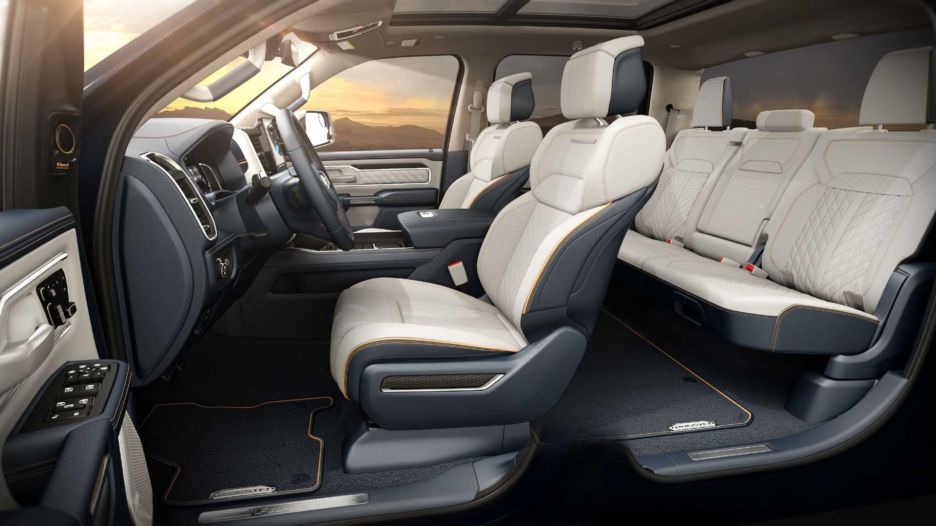 Kabína je rovnako ohromujúca s najvyššou verziou REV Tungsten ponúka prémiové kožené sedačky, audio systém Referenčná premiéra Klipsch s 23 reproduktormi a tromi dotykovými obrazovkami s uhlopriečkou 12, 14,5 a 10,25 palcov pre vodiča a spolujazdca. Úložné možnosti zahŕňajú elektricky otvárateľný kufor s priestorom 15 kubických stôp a RamBox, uzamykateľný úložný priestor s 115 voltová zásuvka vnútri.