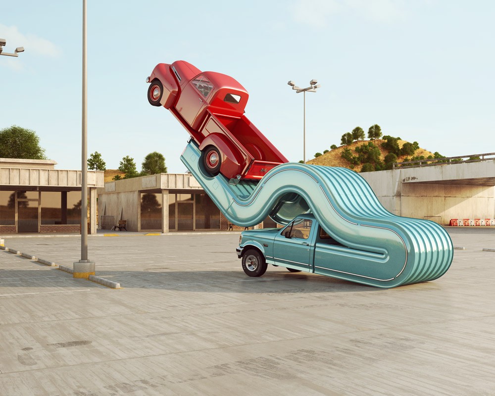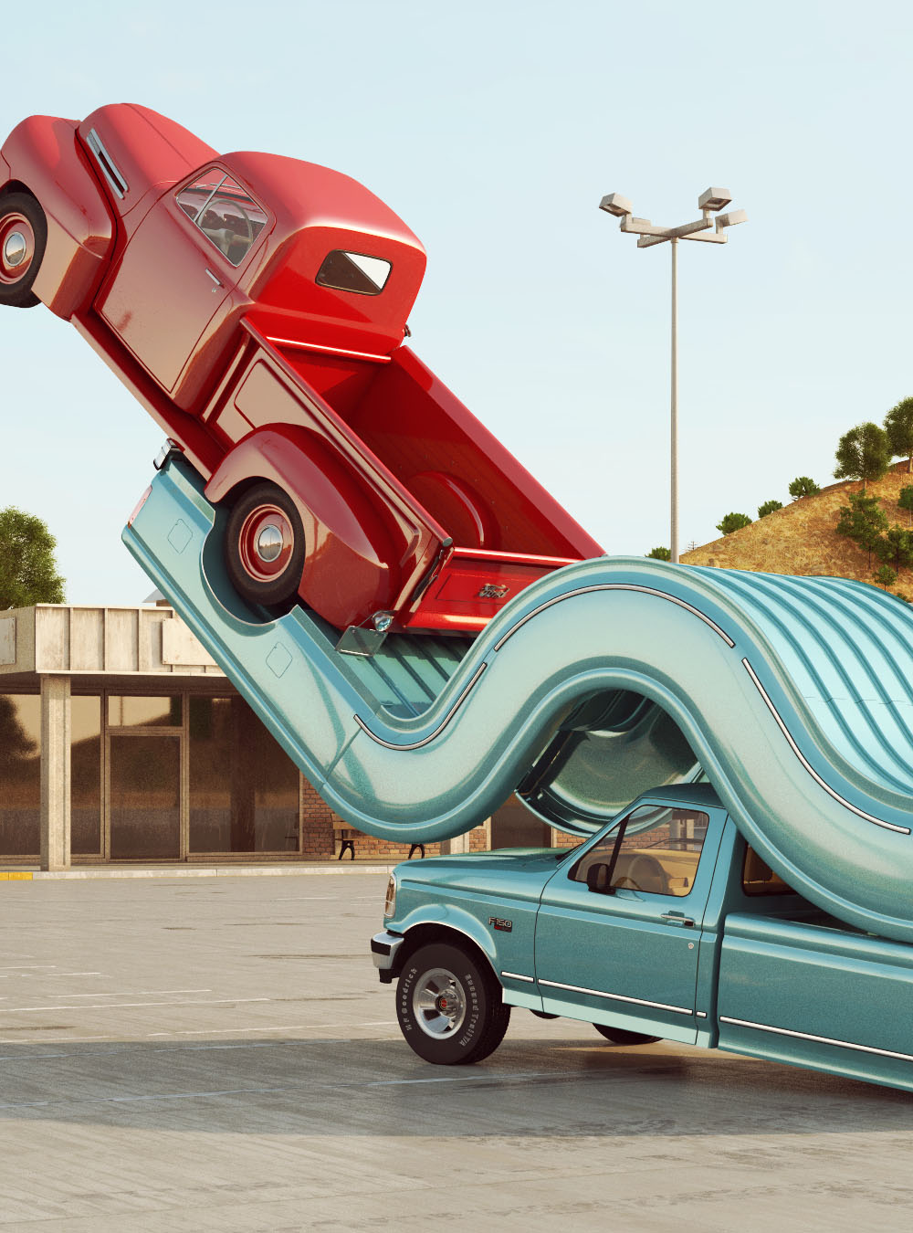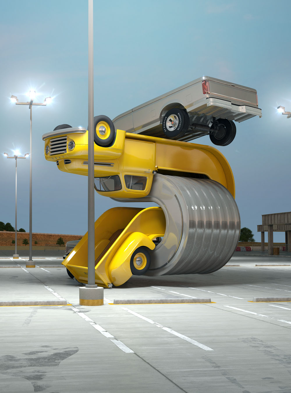 Keď hovoríme o valcovanom plechu, téma väčšinou pristane v čiernej kronike. Ale nie v našom prípade. Konkrétne vám predstavujeme sériu anglického umelca Chrisa Labrooya s názvom „Tales of Auto Elasticity“. Ide o digitálne inštalácie, zakrivené rozvozové vozidlá na opustených parkoviskách, ktoré pôsobia ako niečo vytlačené z tuby.