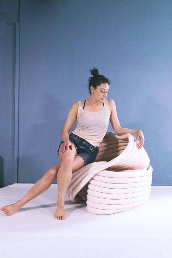 Stol, ki spominja na žvečilko Kiklopa, namreč povzbudzuje uporabnika, da sam poišče in ustvari najbolj ugodno lego in mu ne že vnaprej diktira, kaj je tista prava, zdrava pozicija po črki ergonomije– zravnana drža pa te fore. Gnetljivost te 6-metrske platnene strukture omogoča ‘nadev’ iz ryža, zato lahko ugnesete konfiguracijo, ki vam dani trenutek najbolj pasuje.