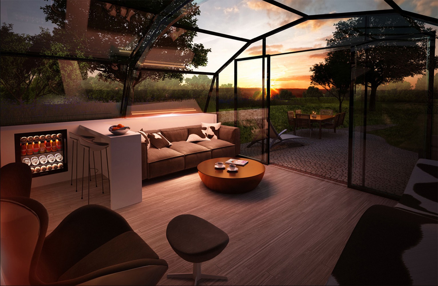 The Photon Space je zasnovan tako, da lahko preko aplikacije na pametnem telefonu preklopimo iz popolnoma preglednega stekla na motno steklo. To ni namenjeno le zasebnosti, temveč tudi boljšim spalnim pogojem in zdravljenju stresa, vključno z anksioznostjo, sezonsko čustveno motnjo, vzdrževanjem energije in libida zdravja. Po želji pa lahko dodamo še dodatno plast stekla za večjo zasebnost.