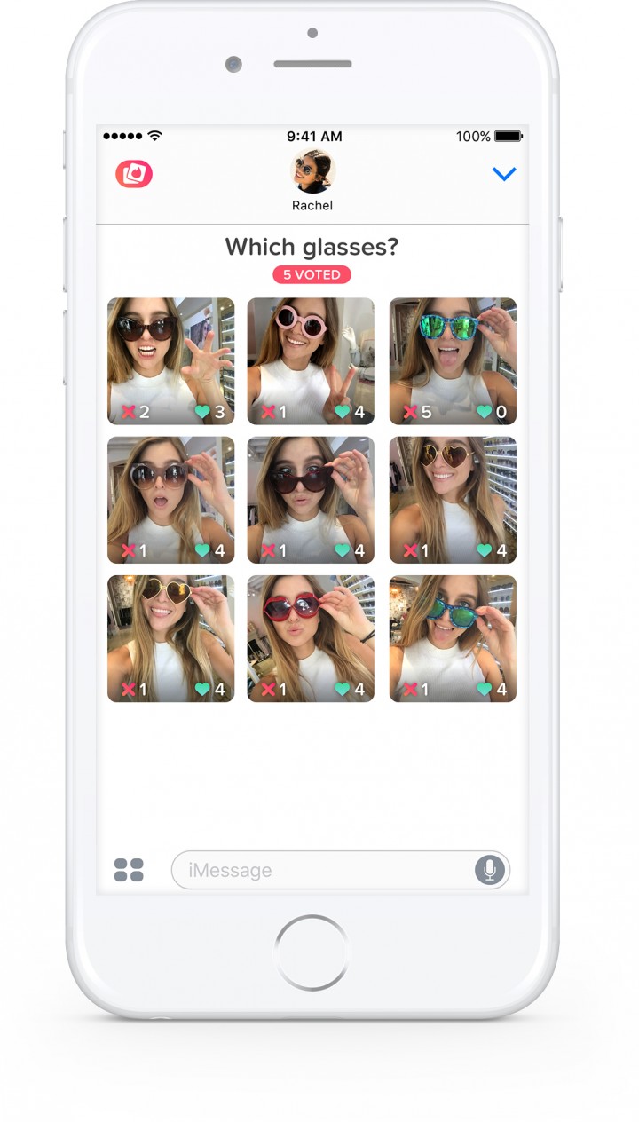 K dispozícii sú zásobníky Tinder pre iMessage (toto bolo nedávno integrované do Operačný systém iOS 10), preto Apple robí správy, ktorá umožňuje posielanie správ medzi jej zariadeniami (nebojte sa, Tinder do toho nesnaží sa vynútiť párovanie), vám umožňuje hlasovať za fotografie, či už ide o selfie, fotografiu auta, outfit, filter fotografií atď. Hlasovať môžete aj za čo by ste si dali na obed alebo aký film? vidieť v sobotu večer v kine. Vaši priatelia iMassage budú na špeciálnej prijímacej stránke, fotoalbum, pozrite si fotografie, ktoré ste zdieľali, a potiahnite prstom doľava alebo doprava po obrazovke hlasovali tým pomôže autorovi pri rozhodovaní (používateľ bude informovaný o výbere priateľov).