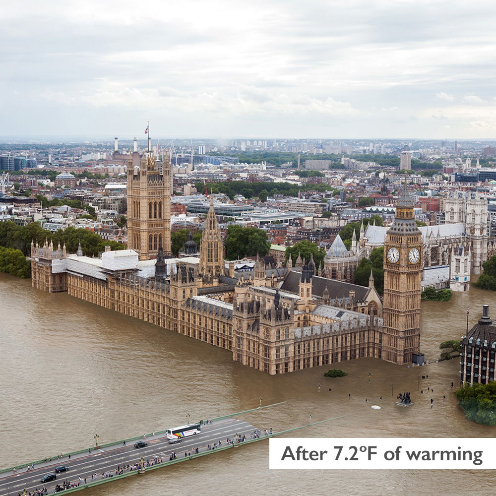 Globalno segrevanje v številkah je eno, a vizualni umetnik Nikolay Lamm nam posledice naraščanja temperatur in dvigovanja gladine oceanov prikaže plastično. Kakšne bi bile nekatere svetovne znamenitosti v slovitih mestih, če bi se povprečna temperatura ozračja do leta 2100 zvišala za 4,5 stopinje Celzija? Večina obmorskih krajev bi končala pod vodo in po znamenitih ulicah Londona, Ria de Janeira, Šanghaja … bi lahko le še veslali.