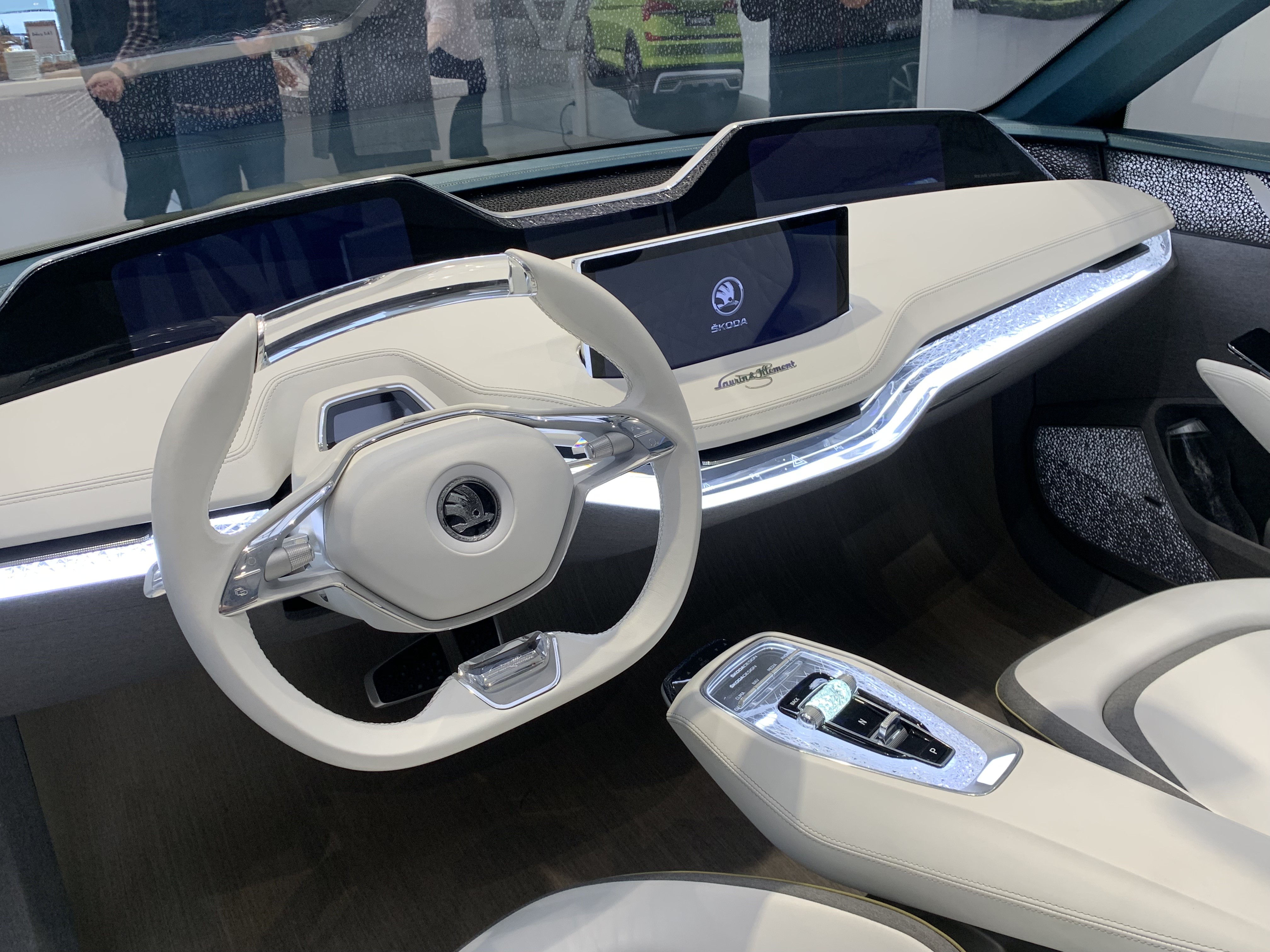 Notranjost Škoda Vision E koncepta ni nič manj zanimiva kot njegova zunanjost. Ker zaradi električnega pogona ne potrebujemo več sredinskega tunela, oziroma konzole, v kateri se je do zdaj skrival menjalnik, imamo zaradi tega na voljo več prostora.
