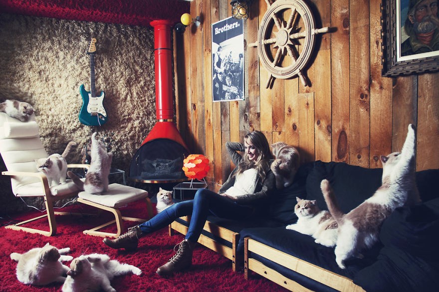 fransk fotograf Andreanne Lupien bevisade med en serie kattbilder att bara för att vi älskar katter och inte kan föreställa oss livet utan dem betyder det inte att vi är stereotypa "katt dam" – en ensamstående äldre kvinna som inte gör något i sitt liv än att mata och klappa sina katter. Enligt urbana definitioner äter han till och med kattmat och har allvarliga samtal med pälsbollar. Andreannes fotografier av passionerade kattsamlare visar helt normala människor som ser bra ut, inte nödvändigtvis är singlar och, att döma av inredningen i deras lägenheter, ägnar sig åt intressanta hobbyer.