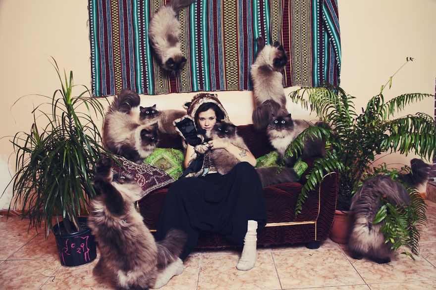 fransk fotograf Andreanne Lupien bevisade med en serie kattbilder att bara för att vi älskar katter och inte kan föreställa oss livet utan dem betyder det inte att vi är stereotypa "katt dam" – en ensamstående äldre kvinna som inte gör något i sitt liv än att mata och klappa sina katter. Enligt urbana definitioner äter han till och med kattmat och har allvarliga samtal med pälsbollar. Andreannes fotografier av passionerade kattsamlare visar helt normala människor som ser bra ut, inte nödvändigtvis är singlar och, att döma av inredningen i deras lägenheter, ägnar sig åt intressanta hobbyer.