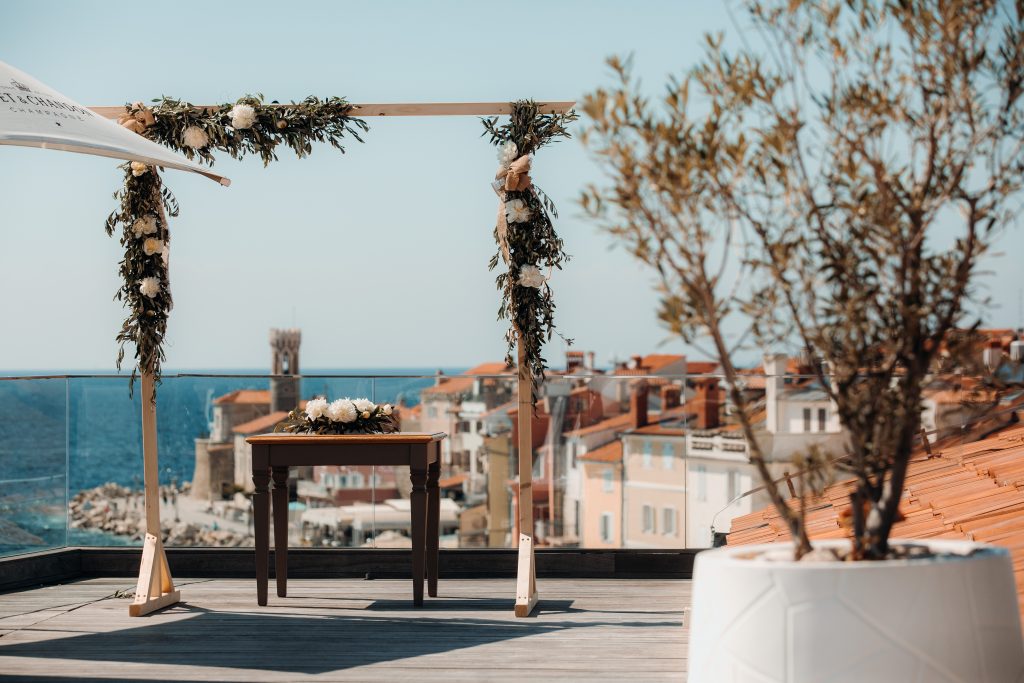 Vad kan vara vackrare än ett vackert sjöbröllop? På taket av Hotel Piran kan du säga dina löften medan du lyssnar på havets brus och utsikten över Piranbukten. Det råder en mycket speciell atmosfär på terrassen vid solnedgången, när utrymmet förvandlas till vackra nyanser som förblir präglade även på bröllopsbilder. Hotel Piran passar för bröllop för upp till sjuttio personer.