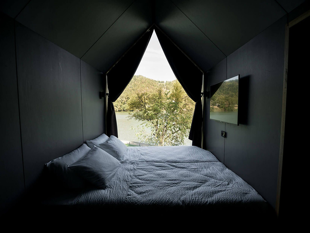 Na idilični lokaciji, nedaleč stran od priljubljenega blejskega jezera, se nahaja osem udobnih glamping hišk. Najdete jih v zavetju smrekovega gozda, ob nabrežju reke Save, ki skrbi za hlad tudi v poletnih dneh. So plod dela slovenskih obrtnikov in slovenskega lesa, zaradi svoje lege pa gostom zagotavljajo popolno zasebnost, nedaleč stran od turističnega bisera. Opremljene so tudi z zasebno zunanjo kadjo in savno, razvajate pa se lahko s slovensko košarico, polno slovenskih dobrot.