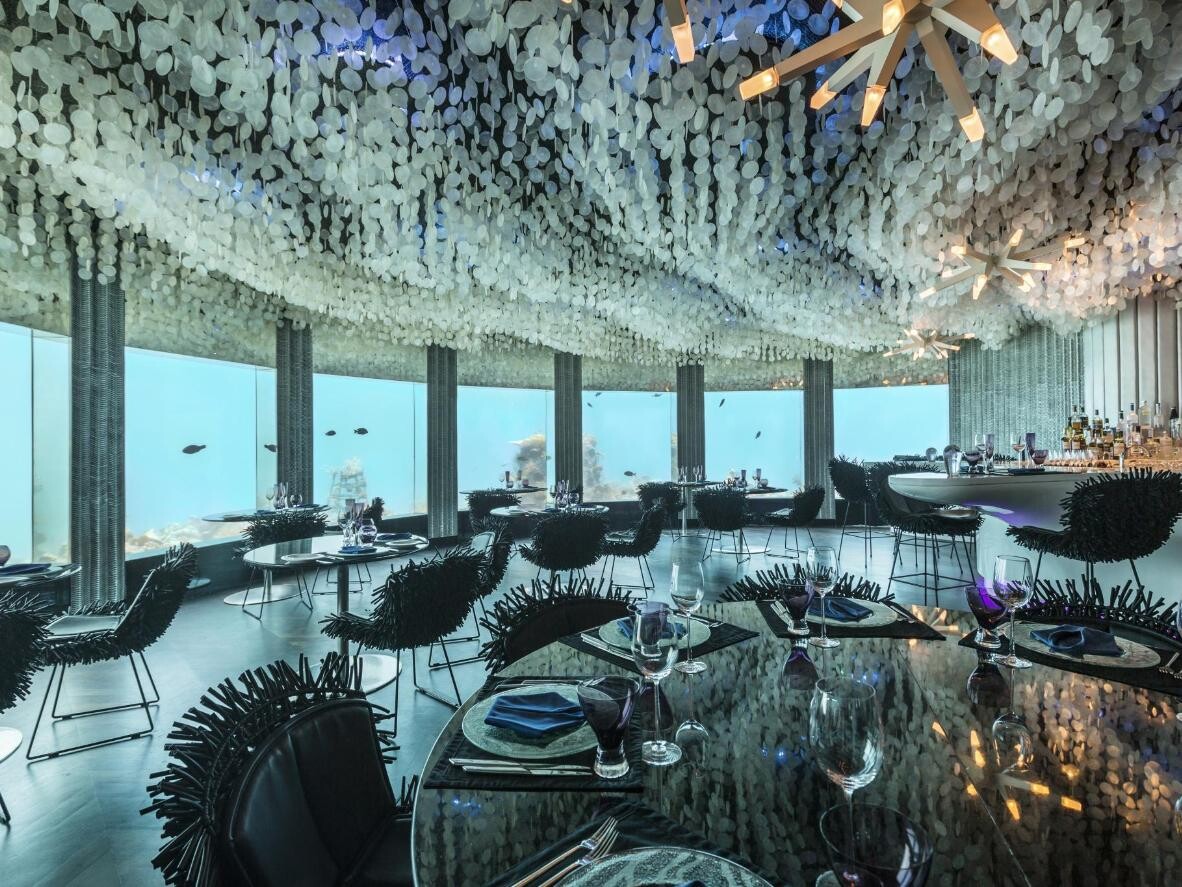 Maldiverna erbjuder ett av de vackraste scenarierna under havsytan, så det är inte konstigt att de flesta undervattensinredningar kommer härifrån. Anantara Kihavah Maldives Villas är ett lyxigt boende med villor över vattnet omgivna av azurblått hav och vita sandstränder. Fastigheten har också en restaurang som heter Sea, där du kan hitta den enda undervattensvinkällaren. Det finns också en rund matplats under vattnet, omgiven av det pulserande livet under havsytan.