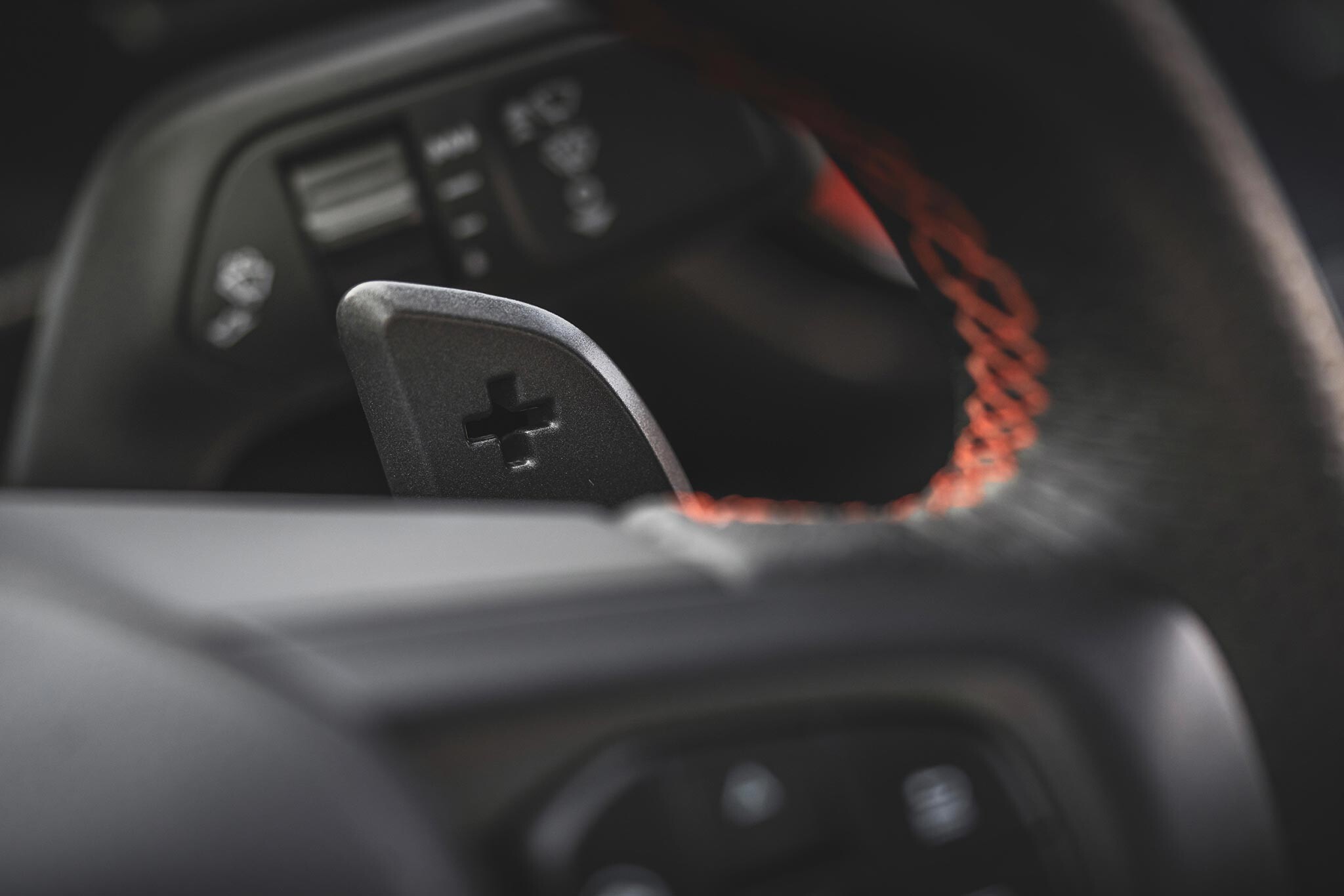 Interiör Ranger Raptor den innehåller helt nya sportstolar inspirerade av stridsflygplan, som erbjuder ökad komfort och stöd vid kurvtagning i hög hastighet. Med Code Orange-accenter och omgivande belysning utstrålar kabinen en energisk offroad-vibe.