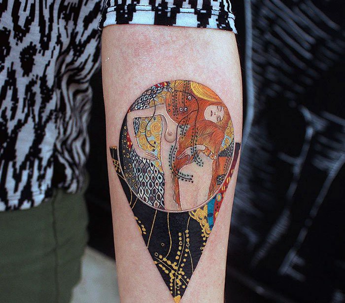 Modernistisk målare han skapade verk som är präglat konstens värld. Deras symbolik erotik, motstånd, sensualitet, liv, av död och av kärlek men ändå lockar alla som älskar att måla. Så några tatuerare har fångat e i sina verkdelar av Klimts målningar och skapade tatueringar, vars färg och symbolik överskrider estetikens gränser. Se hur verken ser ut i bildgalleriet och välj din favorit.
