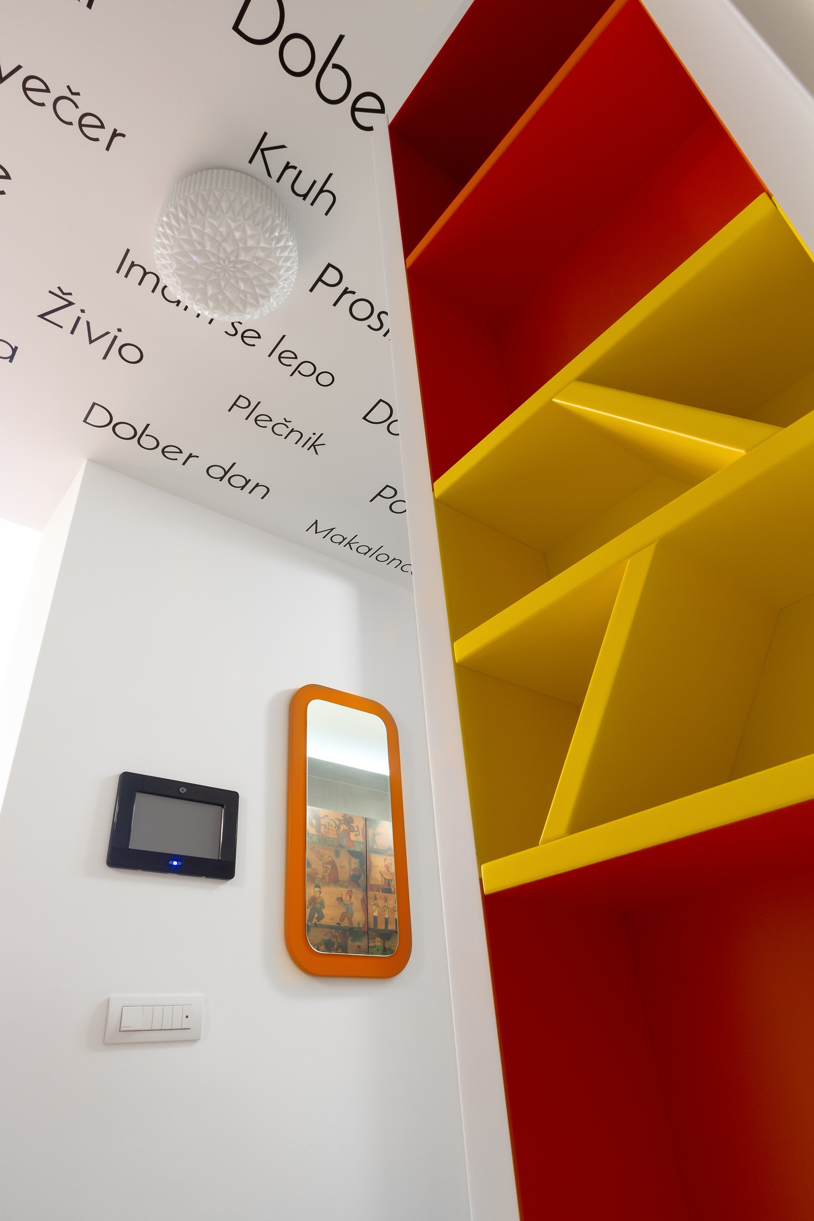 Vid ingången till lägenheten möts besökarna först av vanliga slovenska ord tryckta i taket, skrivna med Plečniks Makalonac-manus. Plečniks sigill det markerar också sovrummet, som är dekorerat med en fototapet med korsmotiv av Stanet Jeršič. Möblerna i sovrummet är dekorerade med motiv traditionella Idrija spetsar, designad av Vanda Lapajne.