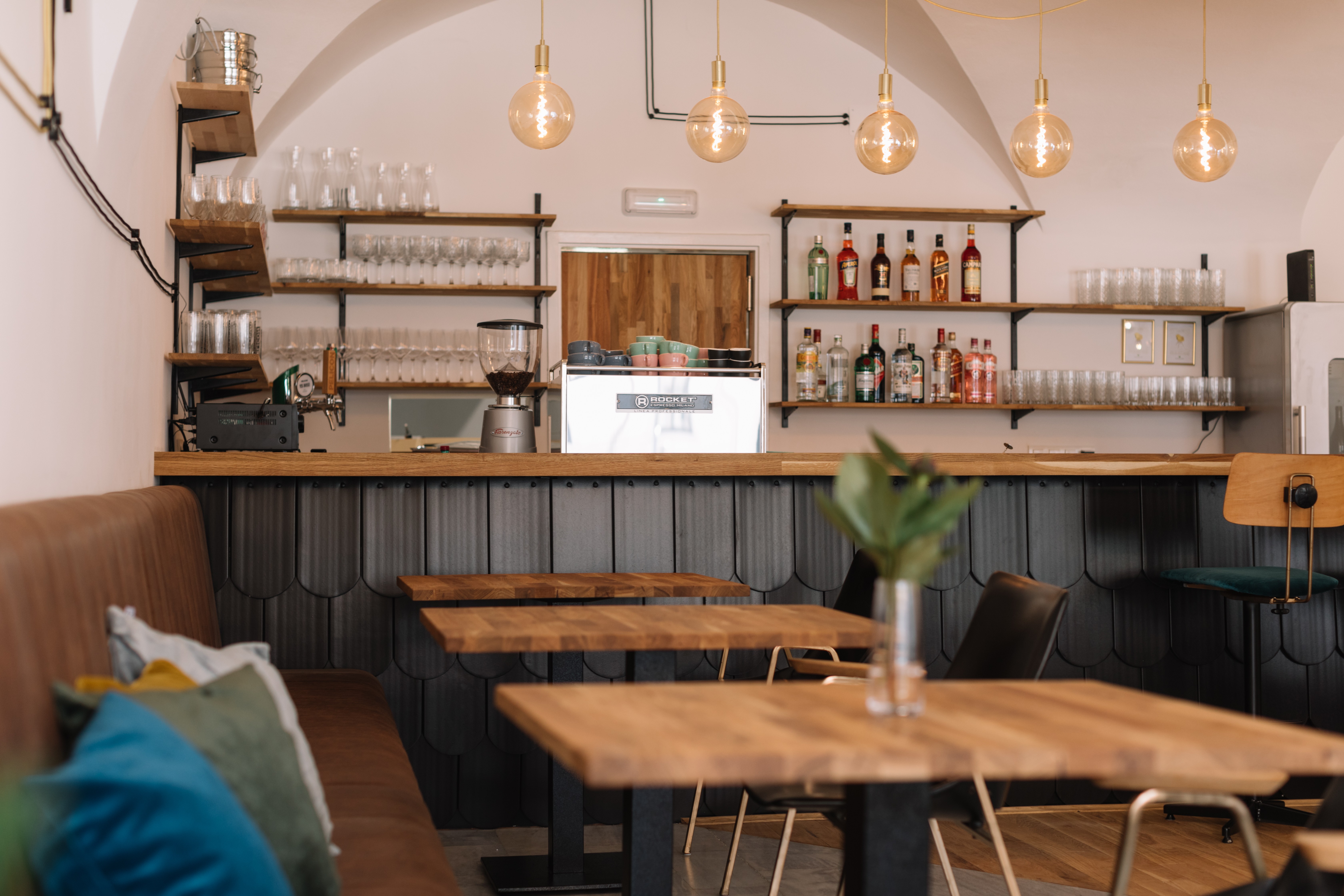 Var är den idag Alexander bistro, var en gång en skoaffär. Utrymmet som sådant var inte anpassat till en restaurang. Ana och Klemen behöll en del delar av rummet - till exempel det ursprungliga golvet (stenmarmor), som vi sedan inkluderade oljad ekparkett, som också är den röda tråden i hela interiören. Dessutom är de alla original valv och en mäktig pelare i mitten av baren, som nu fått en ny funktion, nämligen en mysig sittplats. Framför allt var det viktigt för dem att bevara områdets kulturarv.