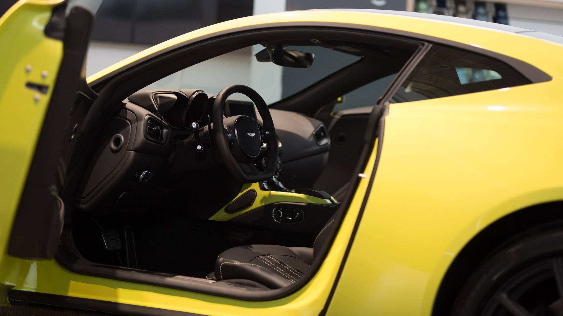 Interiören i nya Aston Martin Vantage känns som om föraren sitter i den. cockpit. Futuristisk känsla ytterligare betonas av växelspaksknapparna, som upptar ett halvcirkelformat område högst upp på mittkonsolen. Jämfört med sin föregångare har den nya interiören mer plats och inspirerades också av en Bond-film. Ratten är avskuren längst ner, vilket ger den en mer sportigt utseende, och föraren måste mer benutrymme.