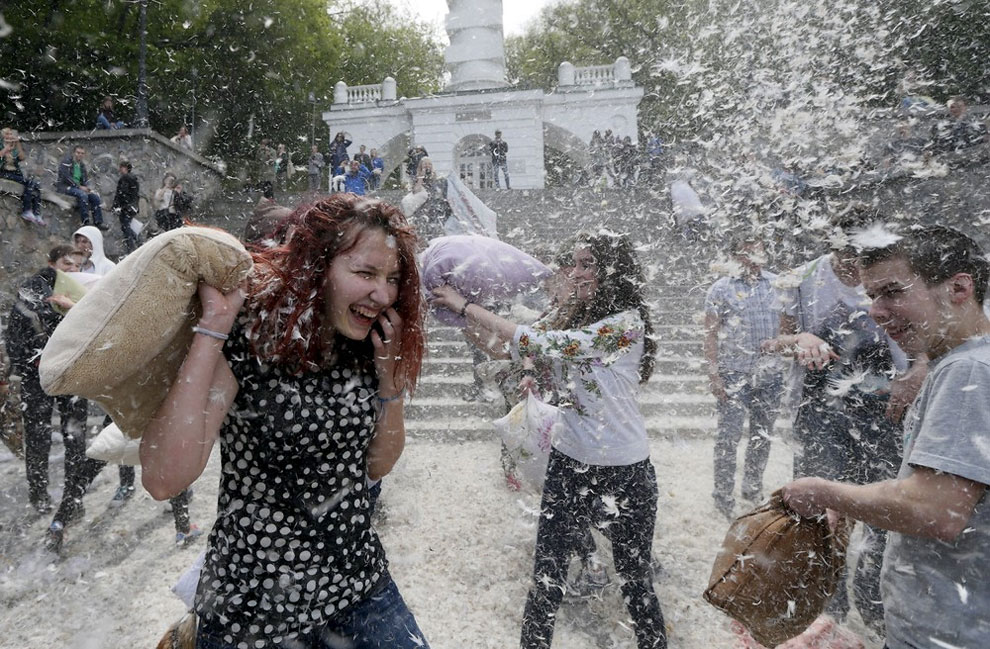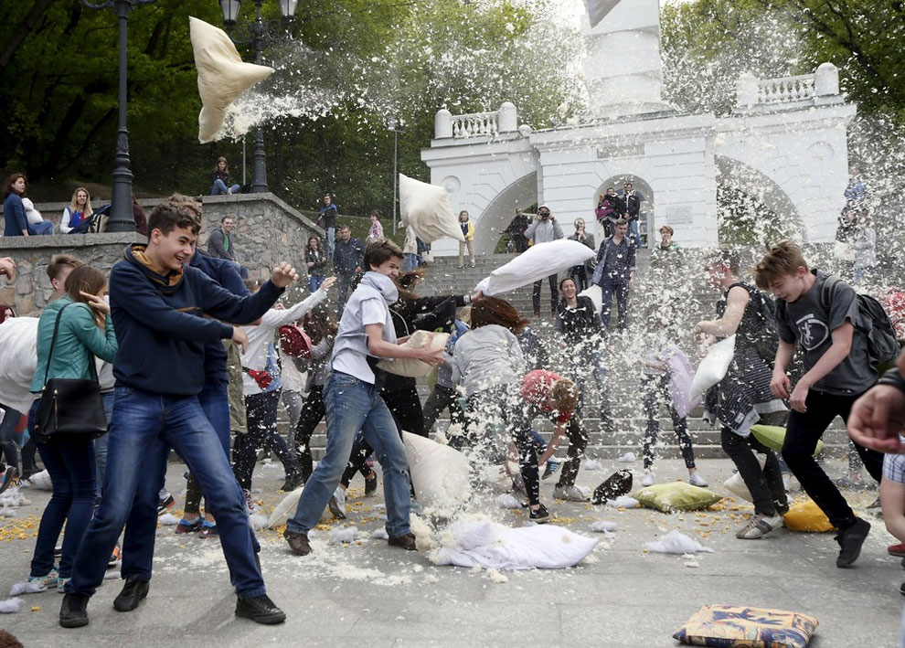 Na ulicah Kijeva se je nedavno odvijala bitka z blazinami, ki je lani potekala tudi v središču Ljubljane. Ker tokrat pri nas dogodka ni bilo, smo pokukali na ulice ukrajinske prestolnice, kjer je frčalo perje iz blazin polnjenih s perjem in puhom. Kot vsaka bitka ima tudi ta svoja pravila. Vsakršno brcanje, boksanje ali grizenje je strogo prepovedano, zato pa so dovoljeni udarci pod pasom, a seveda le z blazino.