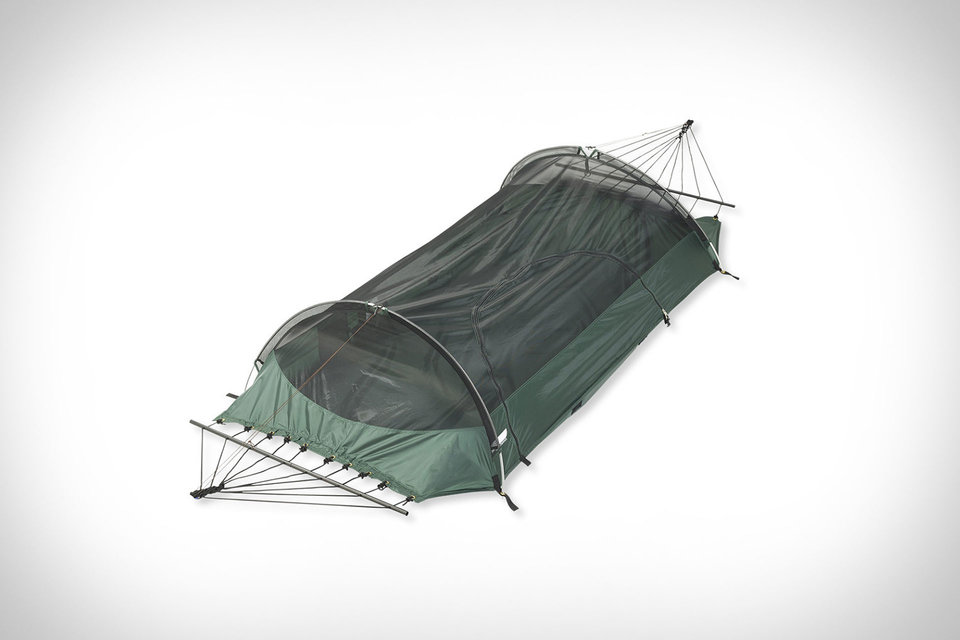 Blue Ridge Camping Hammock navdušuje s svojo vsestranskostjo – uporabljate ga lahko kot visečo mrežo, ki bo po zaslugi funkcionalnega sistema razvrščanja palic vselej ravna in napeta. Obenem služi tudi kot kompakten šotor, ki ga je mogoče pritrditi na tla.