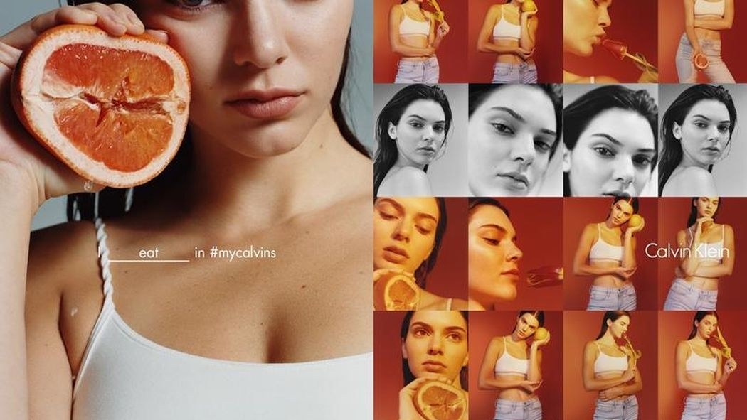 Calvin Klein höjer damm igen och kikar under damkjolar! Med Kendall Jenner, som är den centrala figuren för detta modemärke för andra året, och som liksom Kardashian-Jenner-klanen inte är främmande för provokation, går kampanjen för underklädeslinjen för våren 2016 längre än någonsin tidigare. Kendall Jenner poserar bland annat med en skuren grapefrukt, vilket är mer än en självklar anspelning på kvinnliga könsorgan.