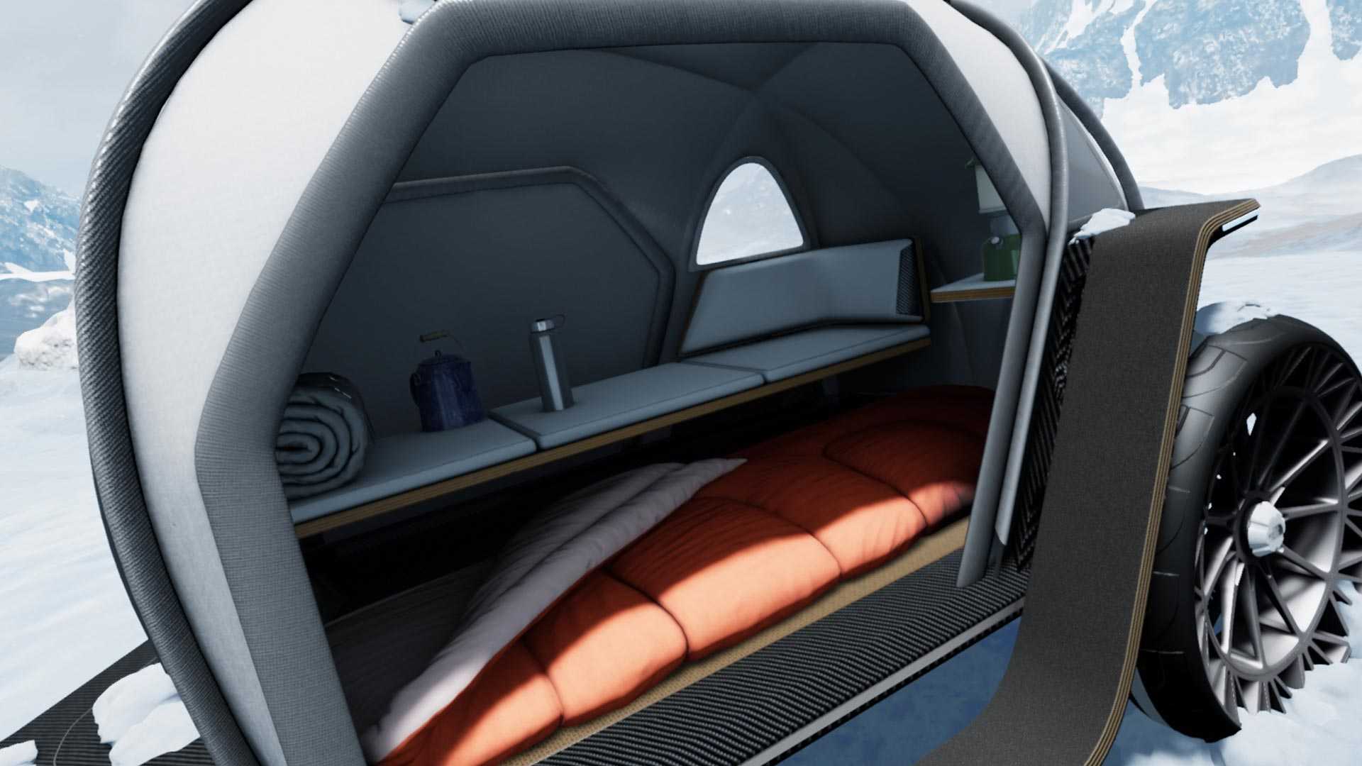 Det yttre lagret av trailern är täckt med material Framtidsljus, vilket ger vattentålighet och andas material, med användning mikroskopiskt små hål, som de lämnar luft. Hos BMW sträckte man materialet till kupolstruktur, som är gjord av kolhaltig fiber. Det finns tillräckligt med plats i släpet för två personer, och släpet kan fästas på bilen och bogseras till önskad plats, precis som alla andra släp. Konceptet kommer att ge en torr övernattning efter att ha utforskat det snöiga landskapet. Hur det är med uppvärmningen vet vi tyvärr inte, men det var nog ingen som tänkte på det, för det är bara begrepp och presentationen av framtidens material, som kommer att användas av varumärket North Face.
