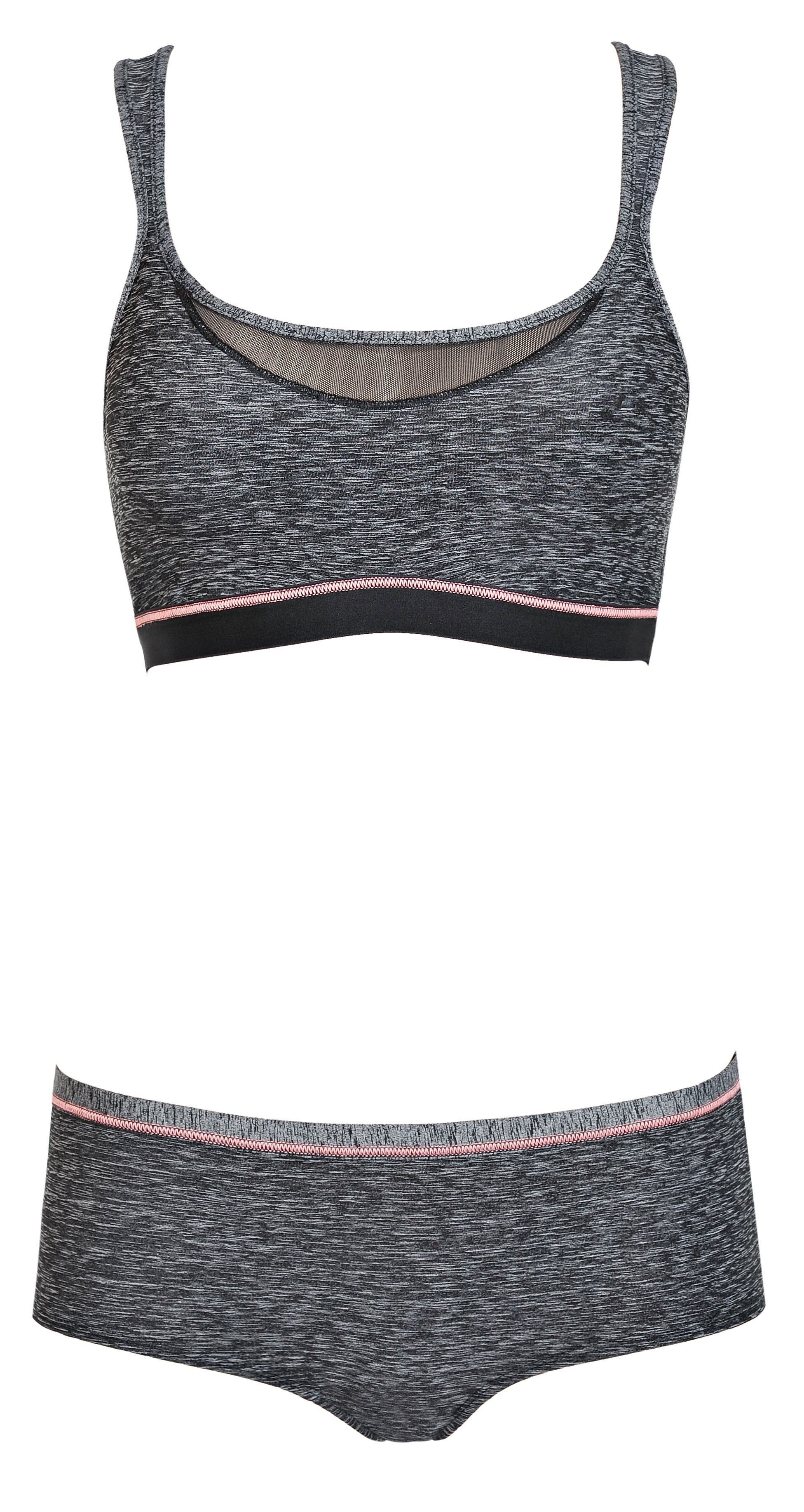 Modrček s penasto oblikovano košarico (na voljo v velikostih od 70B–85E) är brez žične opore in zagotavlja neovirano gibanje (dodatno udobje nudijo naramnice, ki so na ramenih širše in podložene z mehko peno ter se lahko zapirajo križno), medtem ko moden top, ki z detajlom na hrbtu lepo poudari športno izoblikovano postavo, lepo drži prsi med jogo ali med lahkotnim tekom (ponaša se s tanko in mehko košarico, ki naredi lepšo obliko prsi in se lahko odstrani). Serijo Miss Sporty dopolnjujejo še hlačke panty, športna majica in kapri hlače.