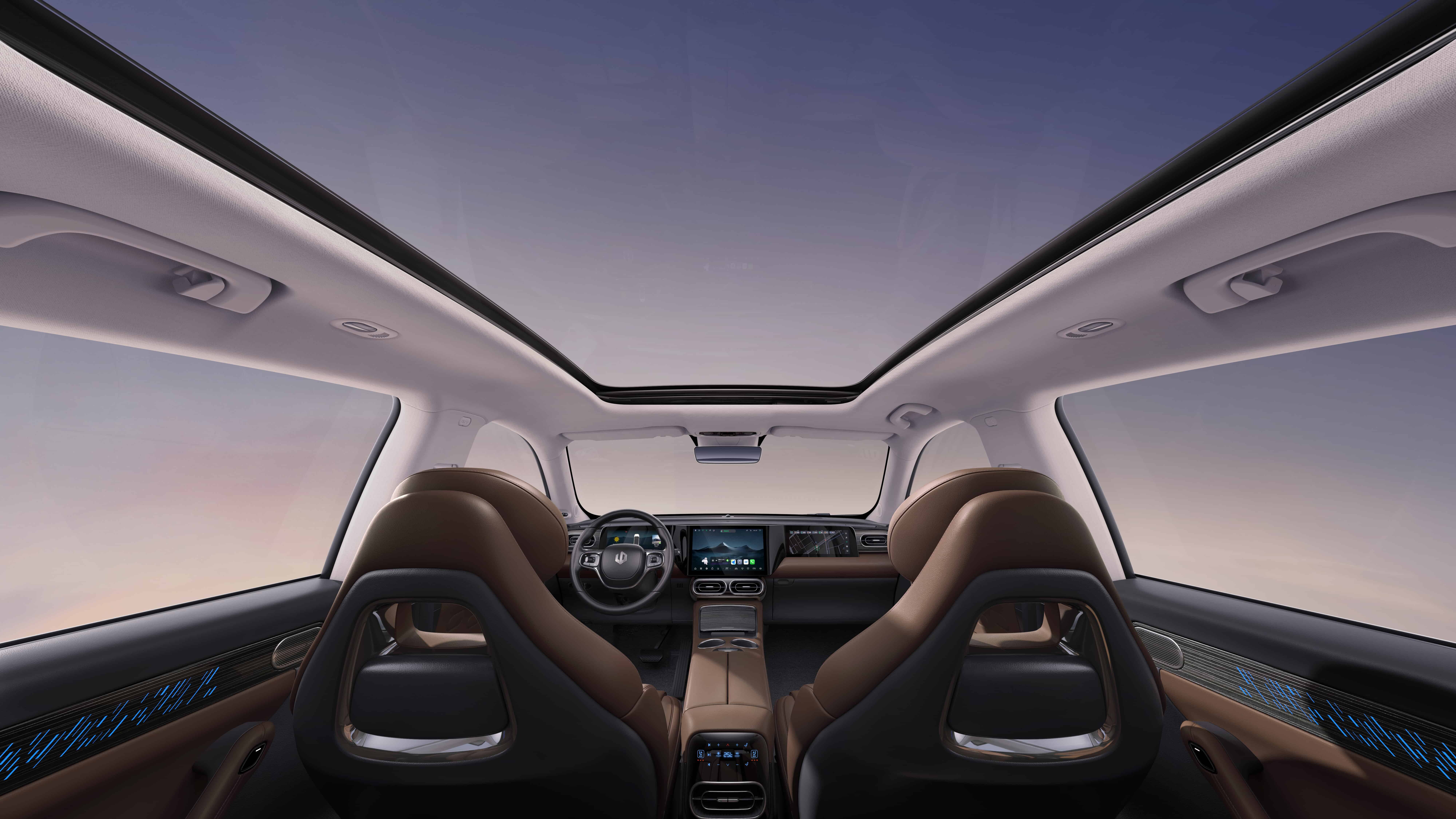 Interiören i denna kinesiska EV är en fröjd för ögat. En sträckt instrumentpanel med en display som spänner över hela bredden och en central pekskärm där du hittar alla appar och inställningar. Ovanför dig finns ett elektrokromt glastak som du kan växla mellan transparent och ogenomskinlig.
